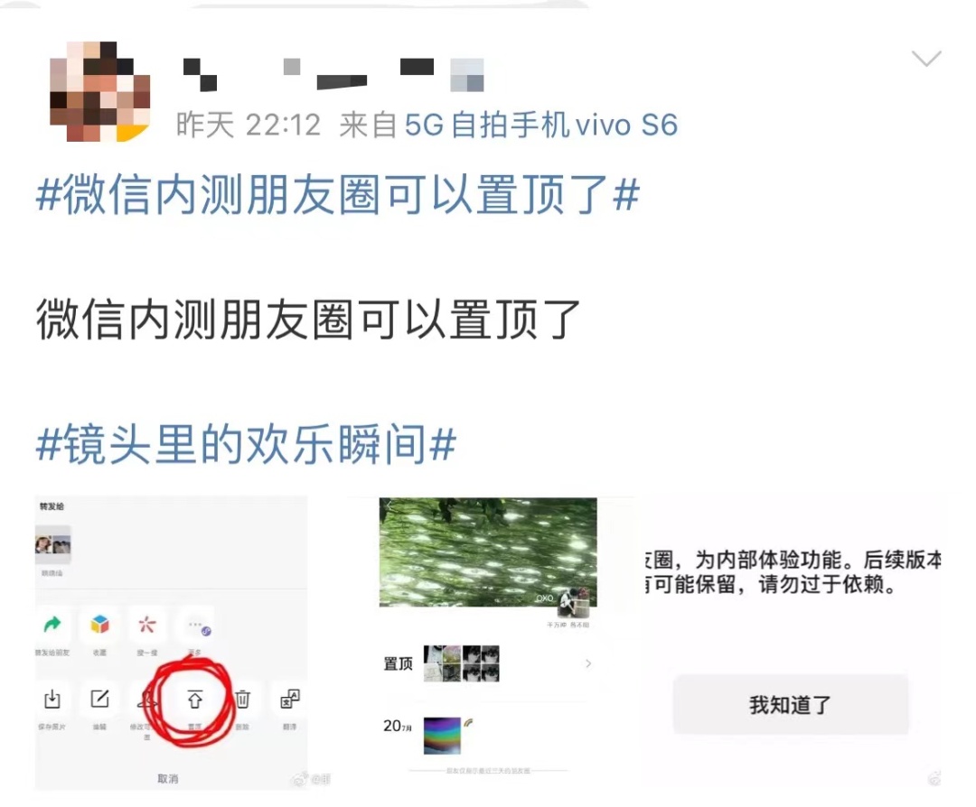一大早 #微信内测朋友圈可以置顶了# 冲上热搜第一 事情是这样的,昨晚,一位博主发帖称微信内测朋友圈可以置顶了。从他发的图片中可以看到,朋友圈可以将某条内容长期在个人页面顶部显示。 点击朋友圈右上角的“...” 便能看到“修改可见范围”旁边多出个“置顶”按钮 从图片来看,即便你设置了3天可见等限制 置顶朋友圈过了公开期后 依然会对外显示 而且,似乎支持置顶多条朋友圈 朋友圈虽然能置顶了 但只有部分人可以用 据了解,这不是微信第一次推出朋友圈置顶功能。 早在2020年,为了推广视频号,微信就出了一个新功能:视频号创作者在直播时,能把直播分享到朋友圈,好友一打开朋友圈便能看到直播出现在置顶位置,而且不能删除,直到直播结束才会消失。 有网友表示,这个功能简直让微商、销售狂喜,对他们来说堪称完美,可以将店铺链接、二维码置顶,让“目标用户”第一时间看到。 不过也有网友表示这个功能用处不大,希望微信推出更多实用的功能↓ 还有网友表示,这个功能半年前就出来了: 你有这个功能了吗? 你希望微信推出那些功能? 留言说说 说不定下个新功能就是它 资料:文汇报 编辑 | 潘婷
