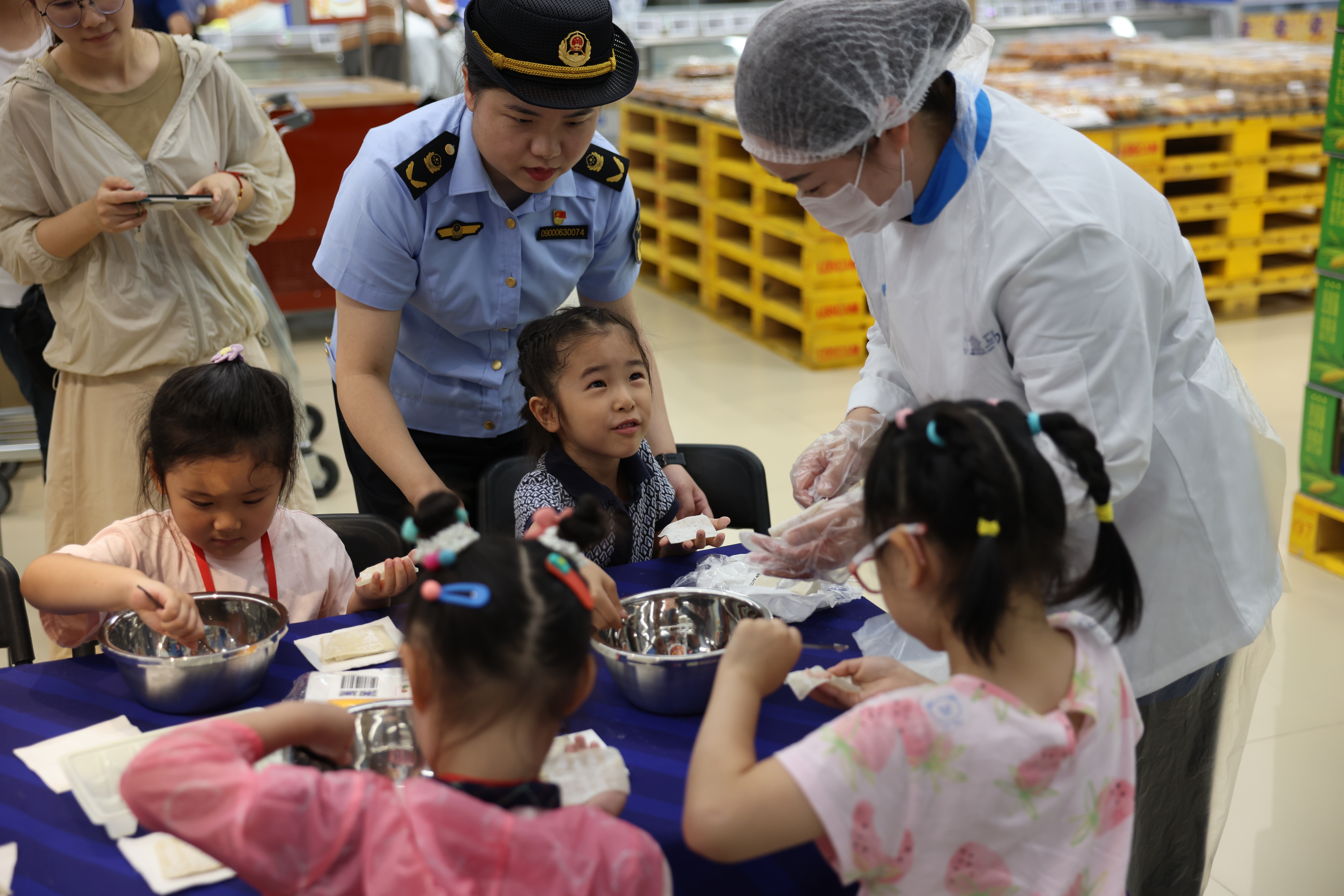 制作好小馄饨后,小朋友们系上围裙,戴上帽子,挂上牌子,一个个又成为了“小小食品安全宣传员”,真如市场监管所执法人员为小朋友们讲解了平衡膳食、果蔬清洗等小知识,并带领他们向超市内的消费者发放保健食品科普手册等宣传资料,让现场的消费者进一步了解食品安全科普知识。