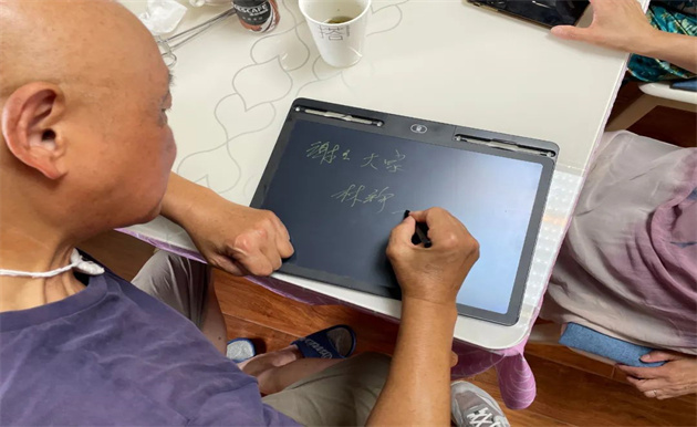 出院后,刚恢复体力的林铮首先想到的就是回到合唱团排练。为了方便交流,每次排练他都随身带着写字板。“写字板一直需要擦写,也挺费力。”朱丽娜看在眼里、急在心里,她在手机上搜索,看到电子喉发声器适用于喉管切除患者,立即下了单。装上电子喉,林铮又可以说话了,但音色上和原来有了很大不同。起初,大家还不能完全听清林铮的发音,经过一段时间磨合,如今的他已经可以和大家正常交流了。琴声、歌声、笑声又重新回到了“同福秋之声”合唱团。