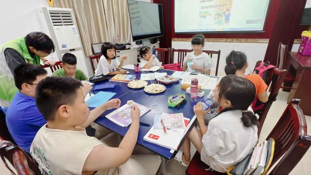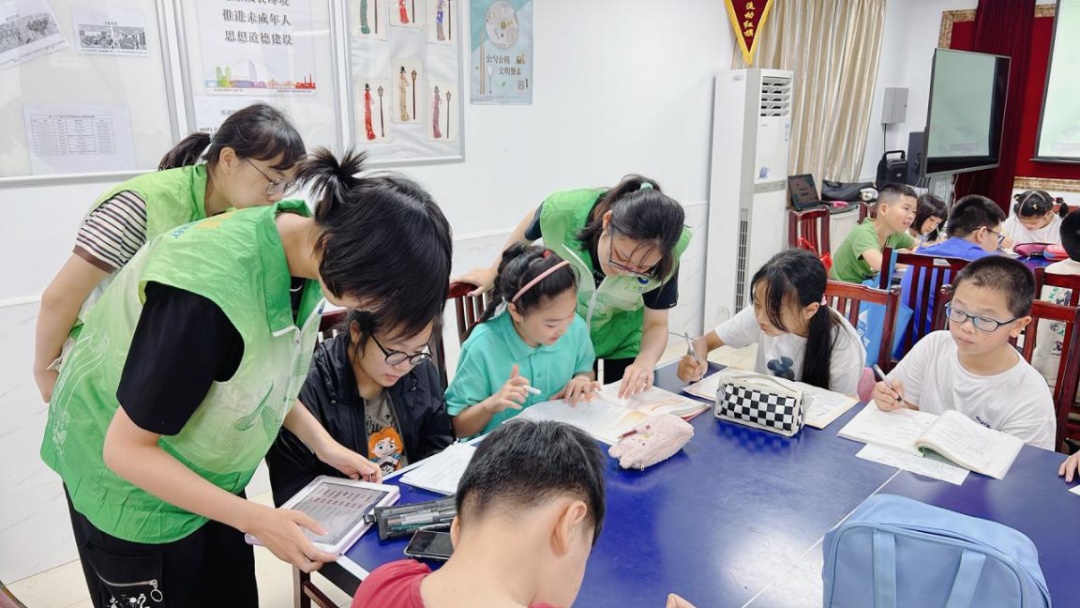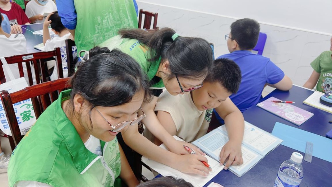 开班仪式上,大学生志愿者向家长和孩子们讲解了办学理念和注意事项,并介绍了志愿团队成员。随后,20名学生被分成小学组和初中组,同学们纷纷拿出暑期作业,遇到不会的题目就请教老师,老师们耐心给予解答。