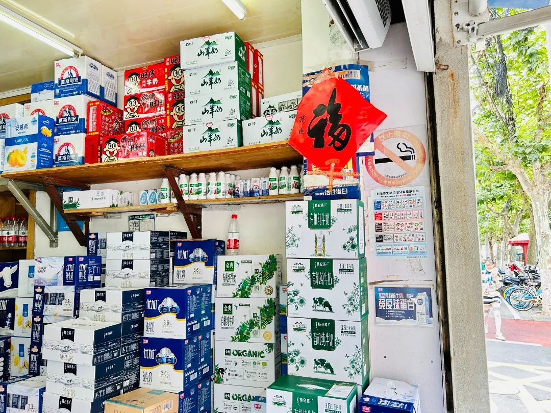 店铺只有20平米左右,虽然名字叫冷饮批发店,但牛奶饮品也占了“半壁江山”,门口货架上摆满了种类颇丰的牛奶。