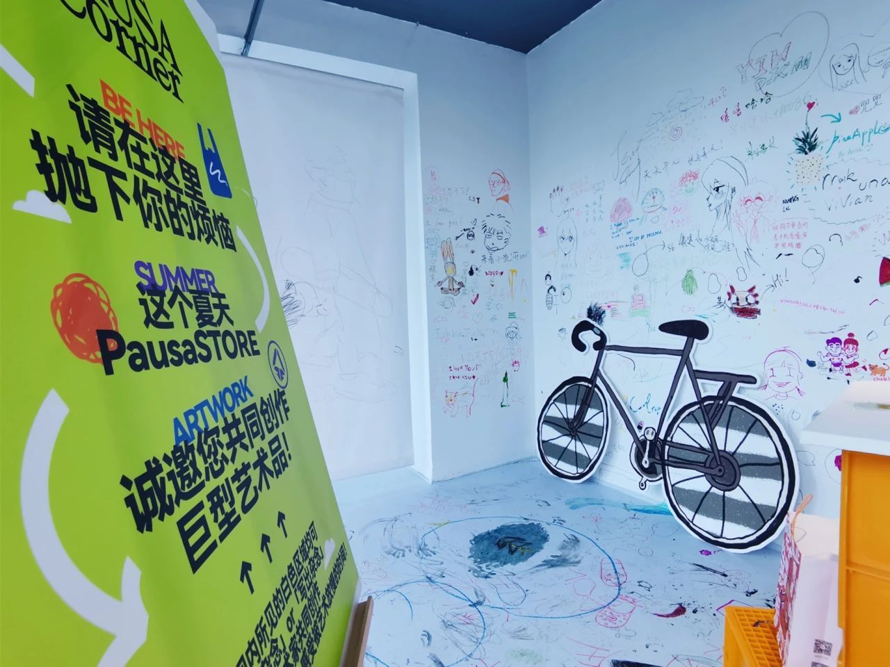 空间一隅,预留了一个别出心裁的“抛杂角落”。纯白的墙面地板上,既有奥特曼、哆啦A梦等形象的童真彩绘,也有如“健健康康”“情绪自由”的美好祝愿。据了解,这里可供来往市民自由创作,天马行空的想象将成为艺术共创的一部分。