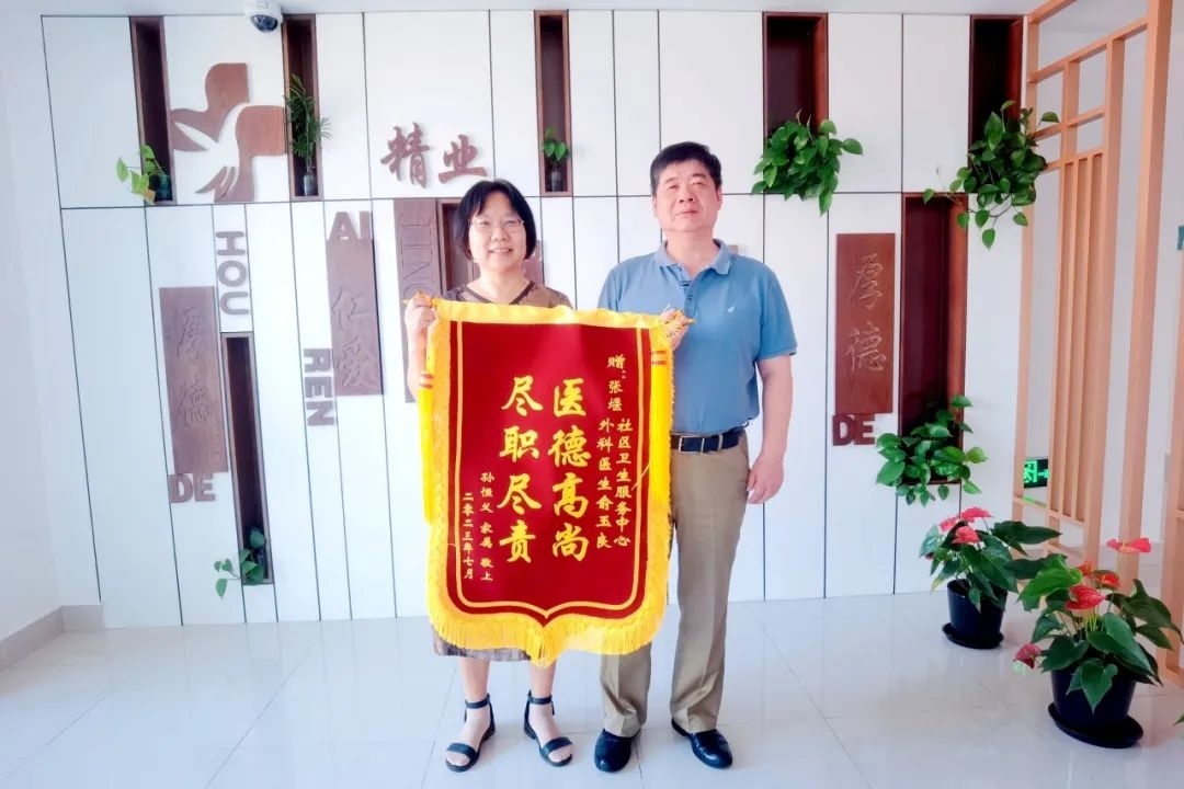 “这面锦旗上的字是我对俞医生最真实的感受……”近日,患者家属沈阿姨将手中印有“医德高尚,尽职尽责”的锦旗交到了金山区张堰镇社区卫生服务中心家庭医生俞玉良的手中。 原来,90多岁的患者孙老伯因腿脚疼痛不便行走,需要经常前往医院打封闭针,但孙辈们都不在金山,孙老伯的女儿沈阿姨和其他兄妹每次只能推着轮椅步行1.5公里到张堰镇社区卫生服务中心外科就诊。近期天气炎热,每次到达社区卫生服务中心后都是汗水涔涔,衣衫浸湿。俞玉良了解情况后,主动联系沈阿姨,提出上门为老人服务。 结束了一天的门诊后,俞玉良便立即背起医疗包,赶往沈阿姨家中为孙老伯打针。沈阿姨感激地说:“占用了俞医生的休息时间,其实我们挺过意不去的。俞医生人很好,有事咨询他,他总是很耐心地指导我们。”