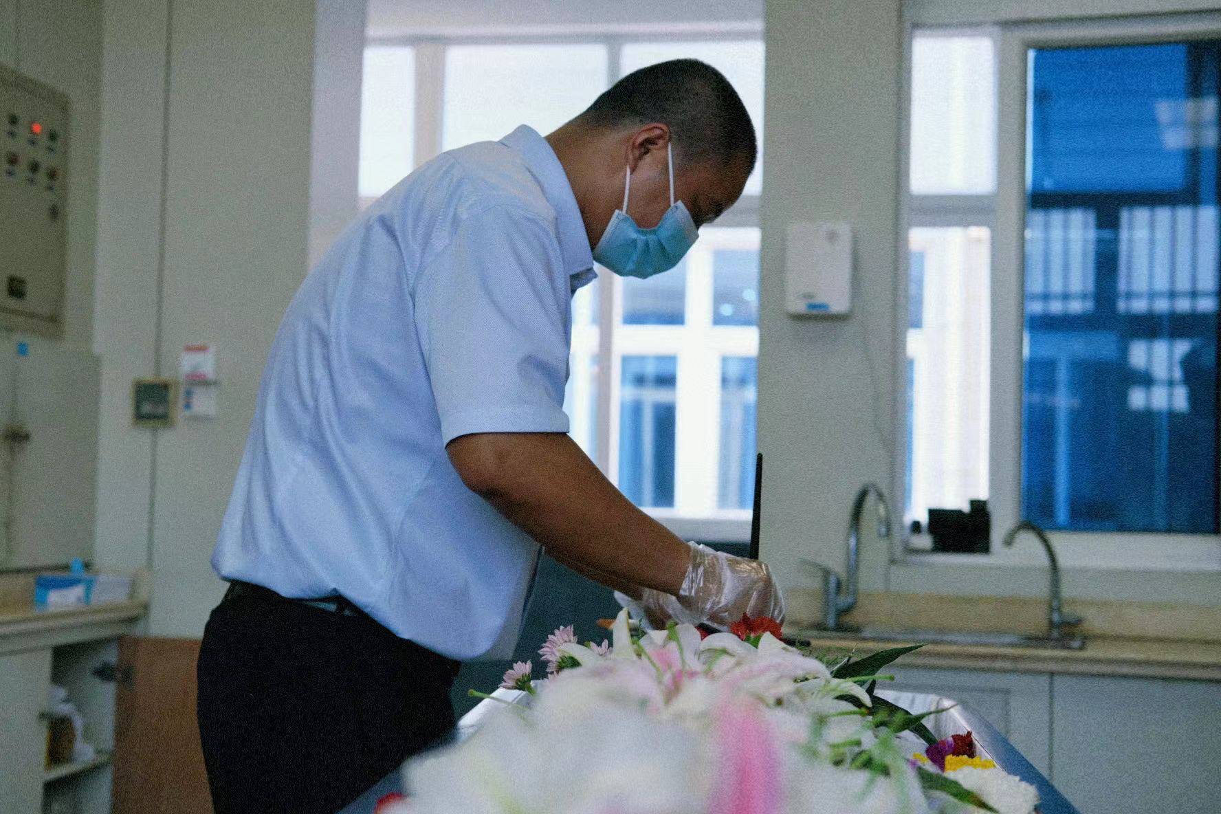 征得逝者家属同意后,我与孙军、钱红连一同进入了遗体化妆间。工作中,他们之间的交流不多,但却环环相扣、井井有条,抬棺、穿衣、理发、铺花、化妆......这些流程比我想象中更加繁琐,每个人都需要扮演“搬运工”、“服装师”、“理发师”、“花艺师”和“化妆师”的角色。