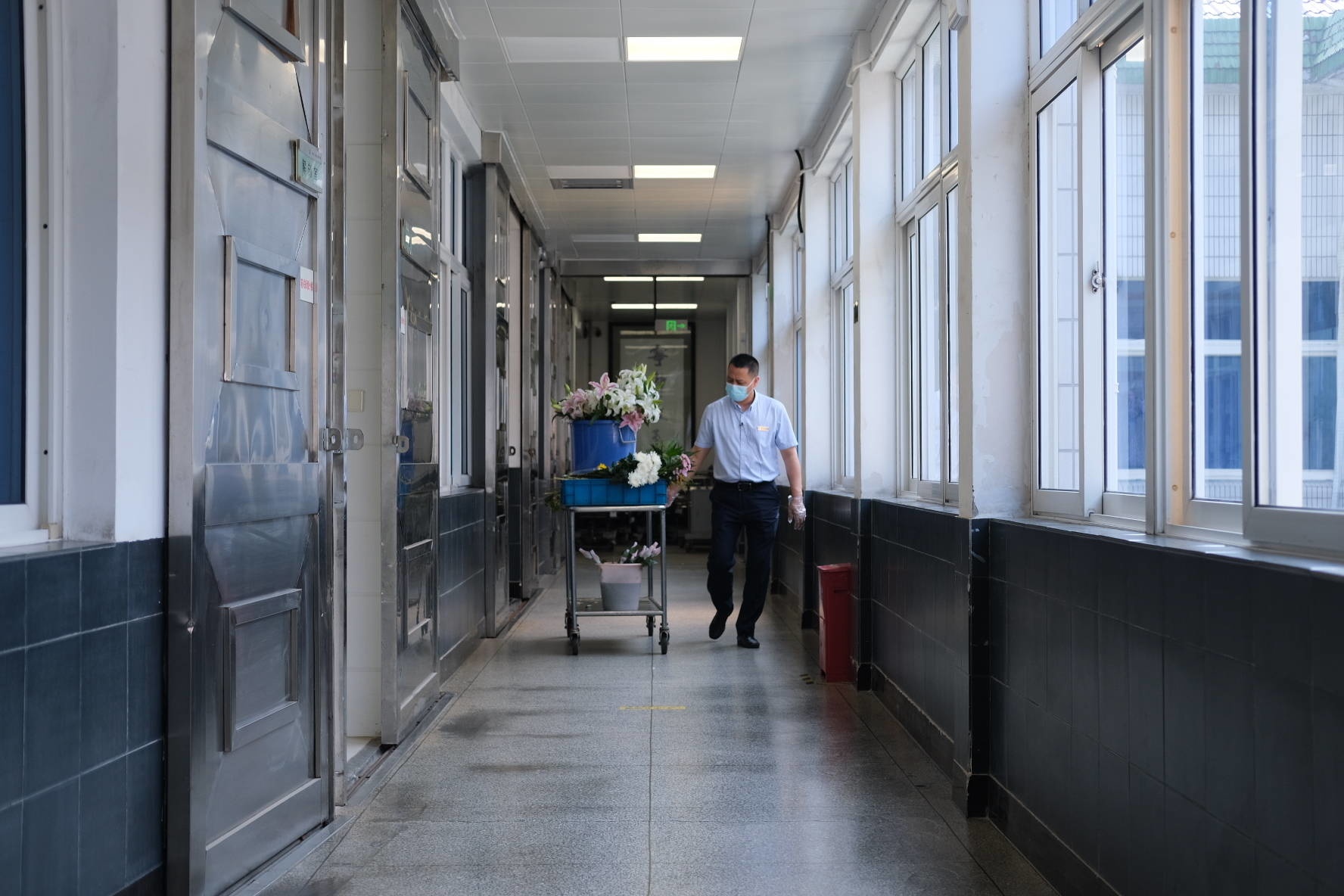初次来到金山区殡仪馆殡殓部,长长的走廊显得格外阴凉。入殓师孙军、钱红连在大厅里与我打了照面,大家默契的没有说出那句“你好”,点头示意后,他们带我来到了走廊尽头,这里就是遗体化妆间,也是入殓师们的主要工作场所。
