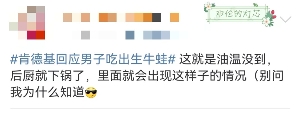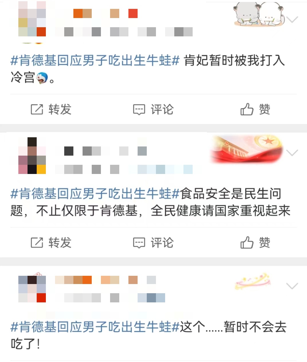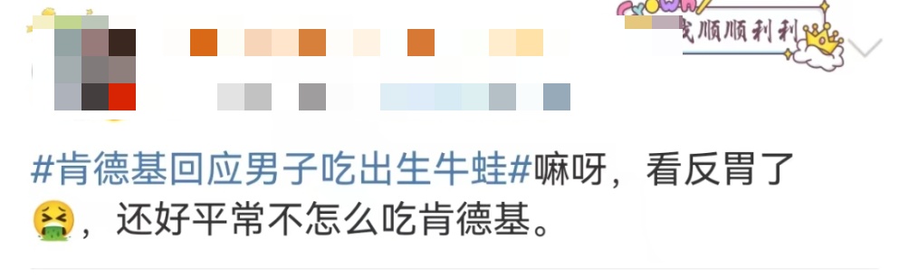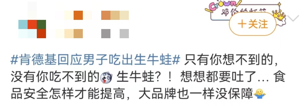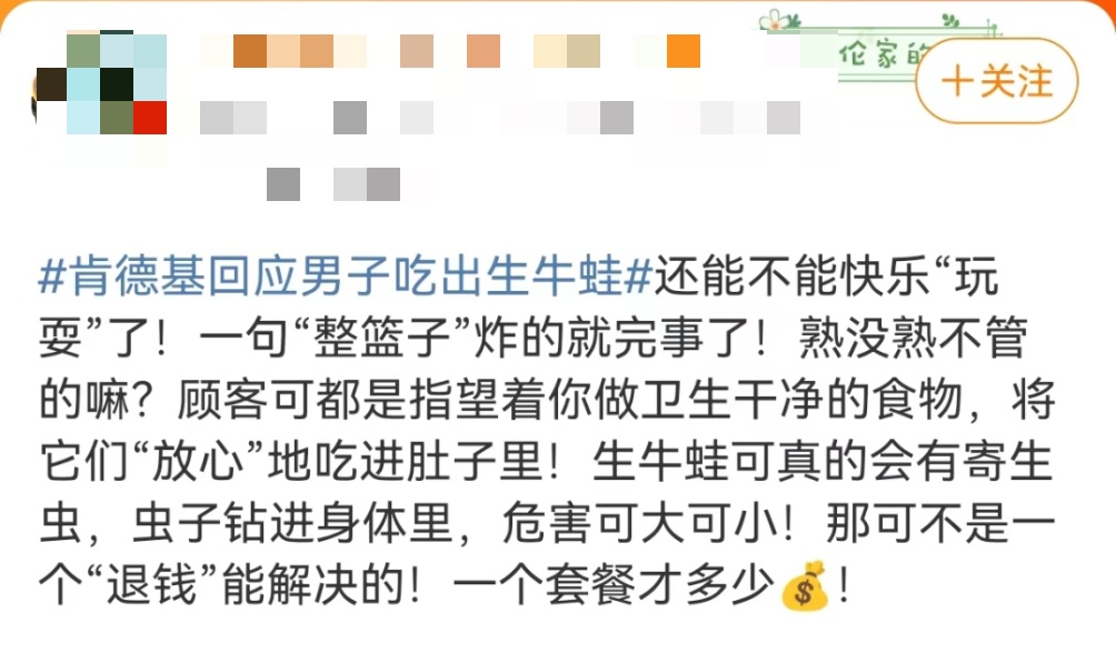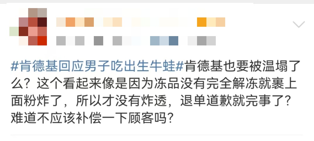 涉事肯德基的工作人员表示,当时已经给该顾客退单,由于牛蛙都是由整篮炸制,当天其他顾客并未反映异常,暂不清楚具体原因。