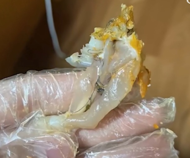 在食用过程中,爆料人李先生感觉该牛蛙塔可的口感有些奇怪,等吃到最后一个时,李先生发现,塔可中的牛蛙竟然是生的,只有外层的表皮炸熟了。