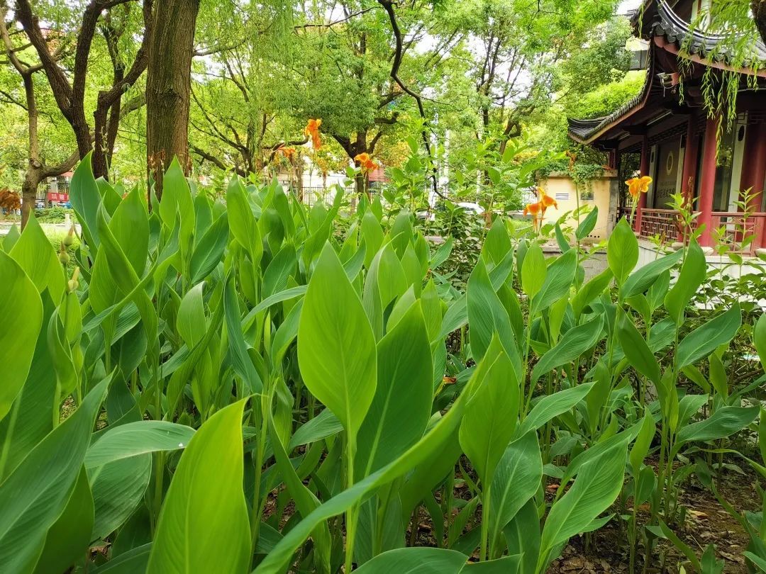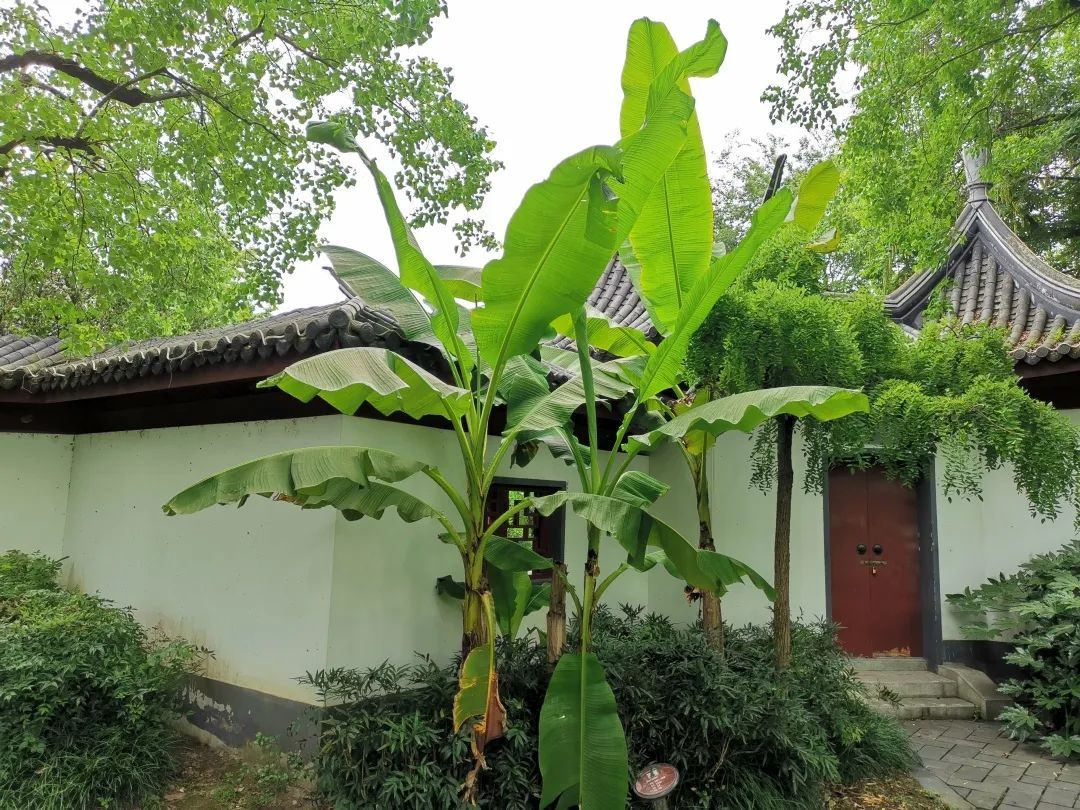 在奉贤古华公园,种植有美人蕉的景点比较多;在古华园晚晴园外,也点缀了几株芭蕉。两者叶片均大而椭圆,鲜绿有光泽,确实有些相似,不过植株“身高”差异很大,也很好区别。
