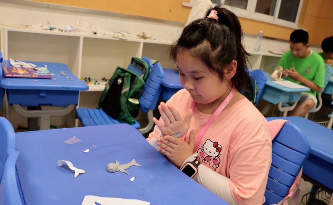 讲解老师以江豚和鱼类的相似点与不同点作为引入,激发学生们的兴趣,引导他们们深入思考。活动过程中,学生们认真观看老师播放的短片,积极回答老师提出的问题。最后,学生们听从老师的指导,用灵巧的双手塑造出一只只可爱的江豚。