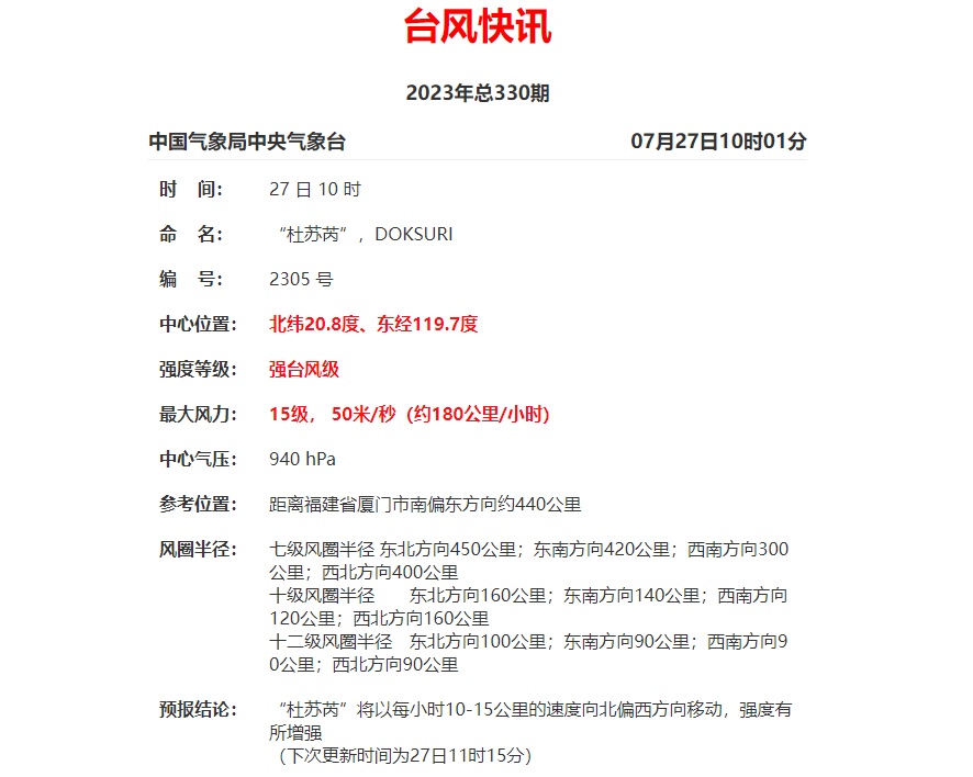 这次的台风有多猛? 中央气象台 今天继续发布台风红色预警 今天,有关台风“杜苏芮” 的多个词条冲上热搜 #台风杜苏芮路径拐了个直角# #厦门7月27日15时起三停一休# 再次升级为超强台风 中国气象局启动台风一级应急响应 今天下午 今年第5号台风“杜苏芮” 再次升级为超强台风 中国气象局启动台风一级应急响应 7月27日17时,台风“杜苏芮”的中心距离福建省厦门市南偏东方向约360公里,中心附近最大风力16级(52米/秒,超强台风级)。预计,“杜苏芮”将以每小时15-20公里的速度向北偏西方向移动,将于28日早晨到上午在福建东山到莆田一带沿海登陆,登陆时强度为强台风级或超强台风级(48-55米/秒,15-16级)。