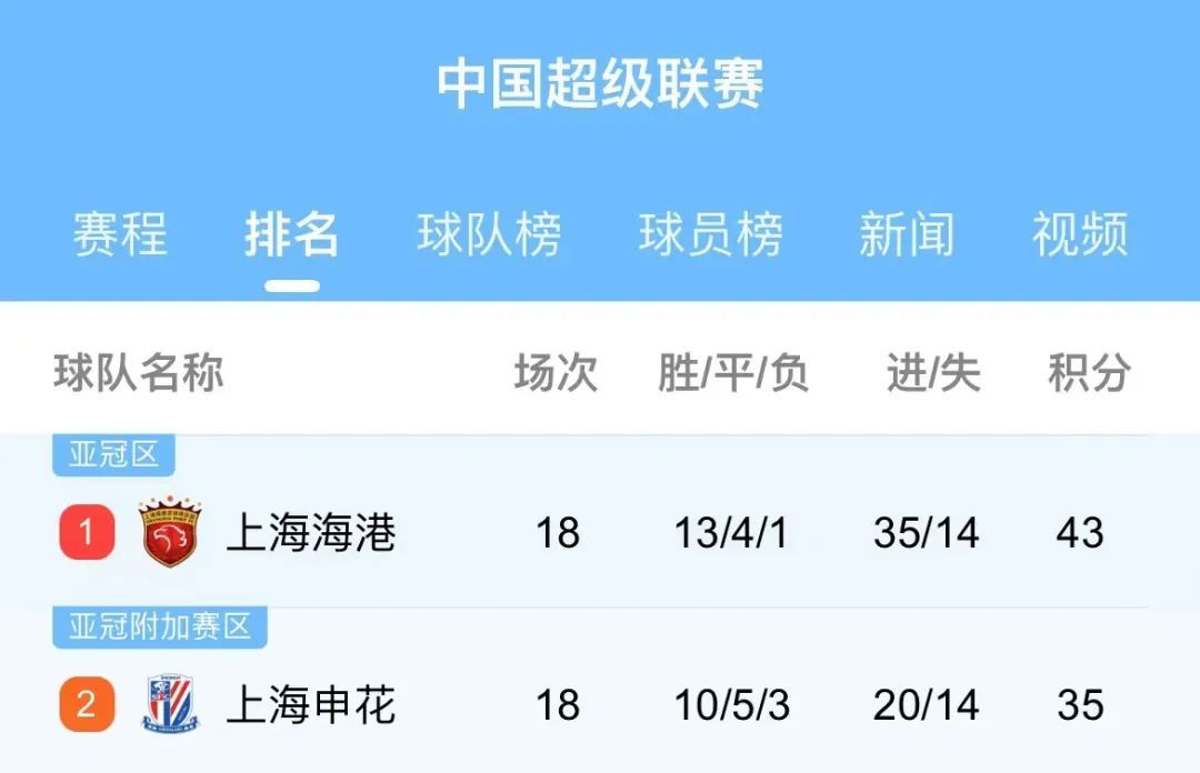 上海海港、上海申花居2023赛季中超联赛排行榜前二
