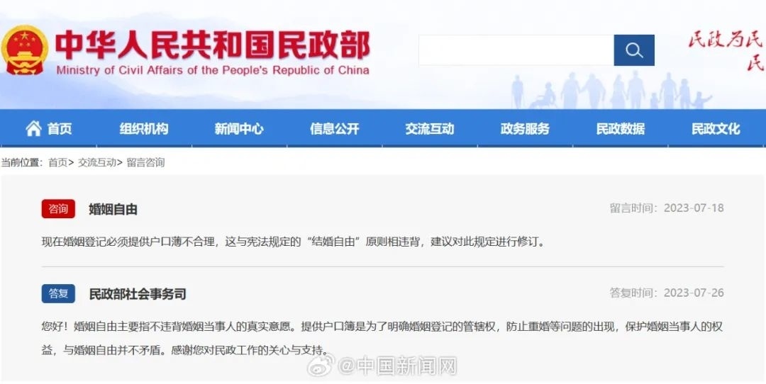 7月26日,民政部社会事务司答复称,婚姻自由主要指不违背婚姻当事人的真实意愿。提供户口簿是为了明确婚姻登记的管辖权,防止重婚等问题的出现,保护婚姻当事人的权益,与婚姻自由并不矛盾。