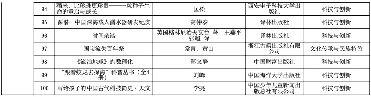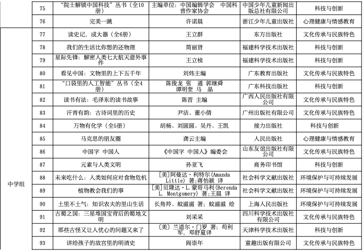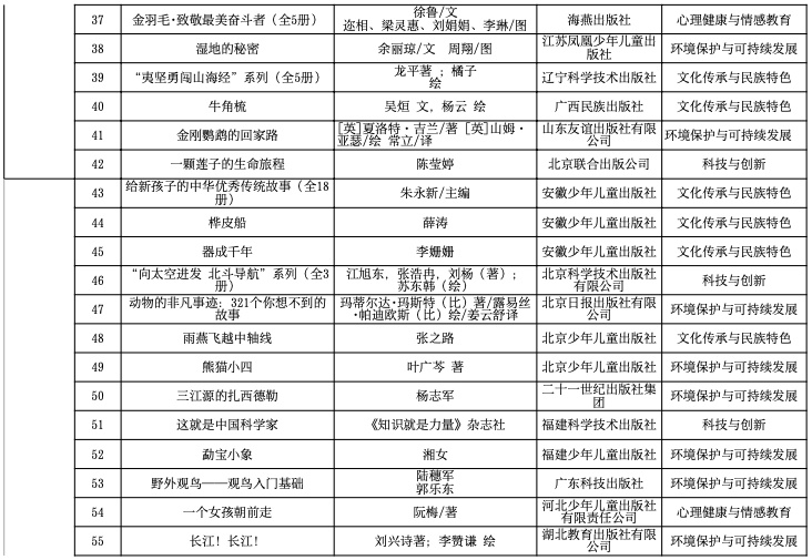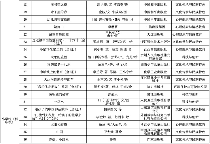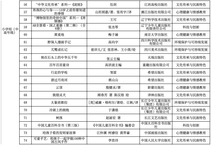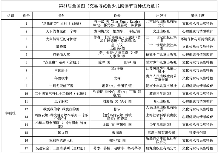 “百种优秀童书”按照年龄段划分,包含:学前组24种,小学低年级组18种,小学中高年级组34种,中学组24种,主题涵盖文化传承与民族特色、科技与创新、心理健康与情感教育、环境保护与可持续发展等四大类。