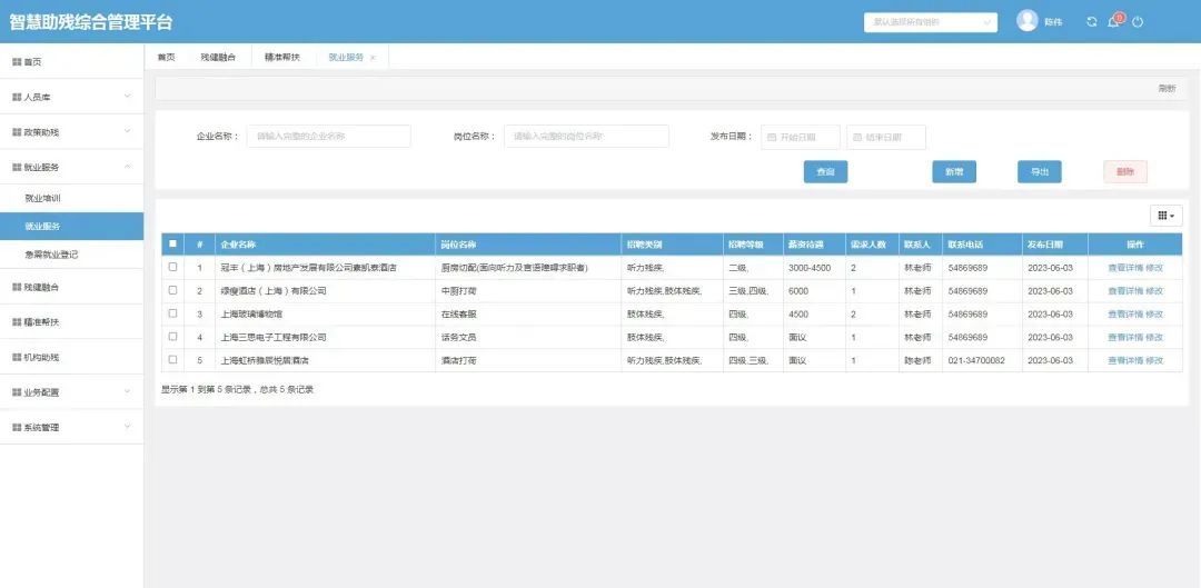 平台内录入适合残疾人就业的用户单位及需求,通过先前培训档案及技能标签匹配用人需求快速形成候选人库,让工作人员能够更高效地送岗位上门并帮助残疾人应聘更适合的岗位,促成残疾人就业并持续跟踪。同时,针对就业意愿强烈的人员,平台内也设有急需就业标签来满足相关需求。