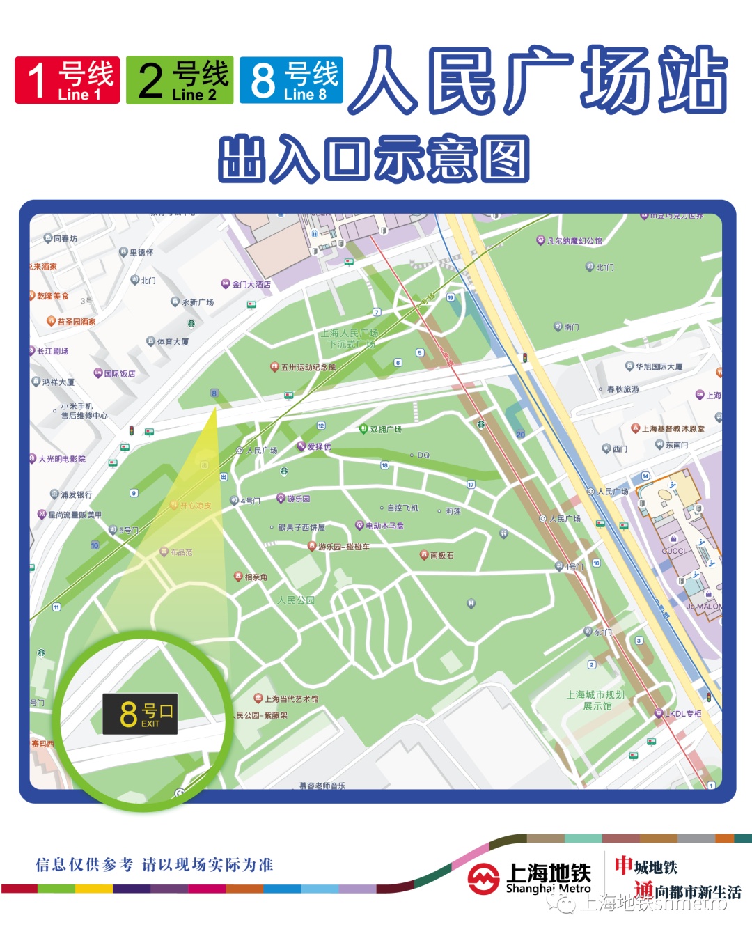 1、2、8号线人民广场站近日,1、2、8号线人民广场站8号口自动扶梯加装施工已完成,该站8号口计划于2023年8月1日运营开始起恢复启用,请乘客留意。
