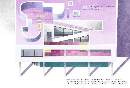 这时,美编老师敏锐地发现,萨伏伊别墅那一页的主色调(紫色)与前后页面及整本书的色调不符合,我们马上请作者进行了新的页面主色调设计。这就是讨论色稿的意义之一,能够在比较早期的阶段检查到可以优化的问题,进行及时调整,而不是画完全部页面后,再推倒重来。