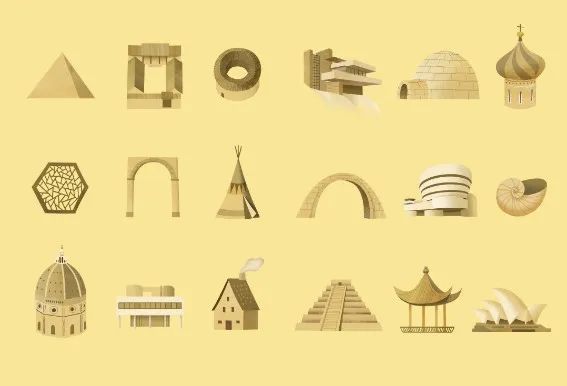 创作之初就明确了希望将形状与建筑融合,但该选择哪些建筑,不同的建筑间要如何联系起来呢?以下是作者列出的第一份大纲,这张小小的纸片,是我们讨论的起点,纸片上包括了后来出现的三角形金字塔、圆形土楼等建筑,但逻辑线还没有出现。最初的灵感通常会是分散的、不成体系的,但只有先不设限,让创意随意发散,形成各种可能性,才能继续穿针引线,从创意库中找到合适的珍珠,最终串起一串珠链。