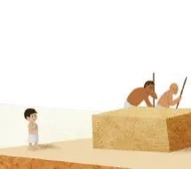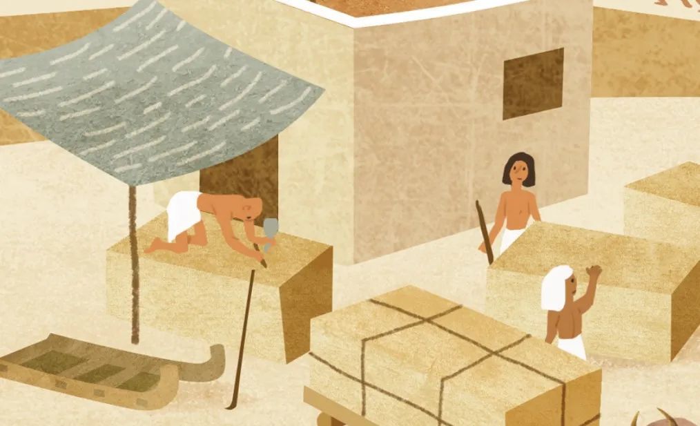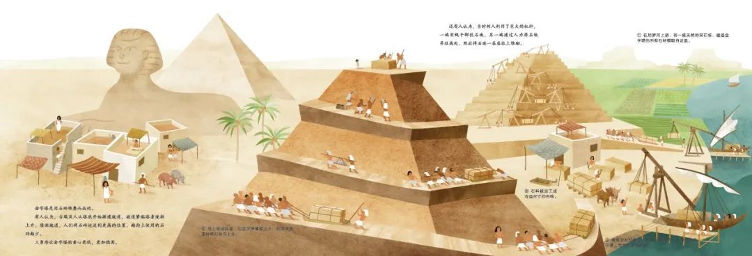 色稿确定后,终于可以精工细作细化画面了。考虑到内容需要展示搭建金字塔的完整流程,我们设计了一个大拉页,展现出壮观的建造场面,这一页上的人物非常多,动作和表情也非常多,作者对此一一进行了细致地刻画。可以看到画面里的一个小角落,放大来看,依然是内容丰富、细节满满的。