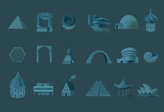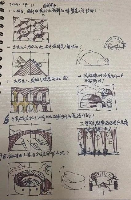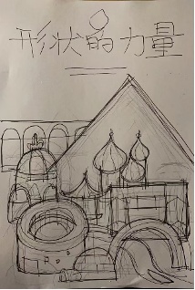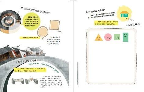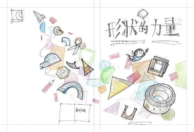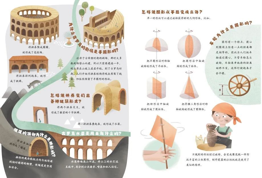 如何为这些丰富多彩的形状和建筑找到一条逻辑主线呢?我们设想了很多种组合形式,最终我们计划从基本形状入手,用形状变化作为逻辑主线。三角形、圆形、方形是三个基本形状;基本形状的切割、旋转形成了半圆形、半球形;形状的进一步的组合形成了拱券、花窗等。到了这一步,整本书的逻辑线就捋顺了,每一页的大致样貌也已经初现端倪了,作者也绘制出了完整的草图。