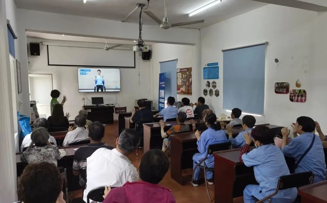 老人们边登记等候,边跟着视频做手指操,练习左右脑,学习心理健康知识。