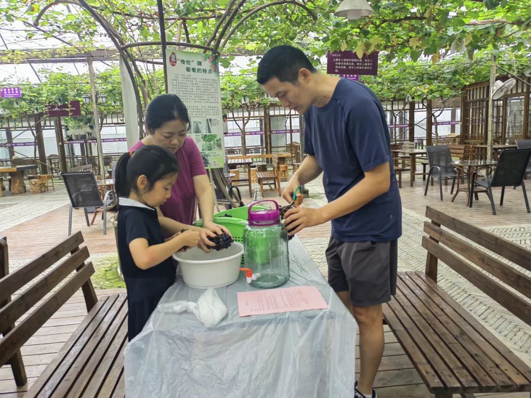 采完的葡萄就是酿酒的原料。“先对葡萄进行清洗和筛选,接着手工捏碎葡萄,最后是发酵……”市民吴晓波一家在工作人员的解说下,耐心地完成每一步的操作。“小朋友喜欢科普知识和手工,今天就带她拓展一下户外活动经历。”吴晓波说,“我们会把葡萄酒带回去慢慢品尝,自己酿的酒很珍贵。”