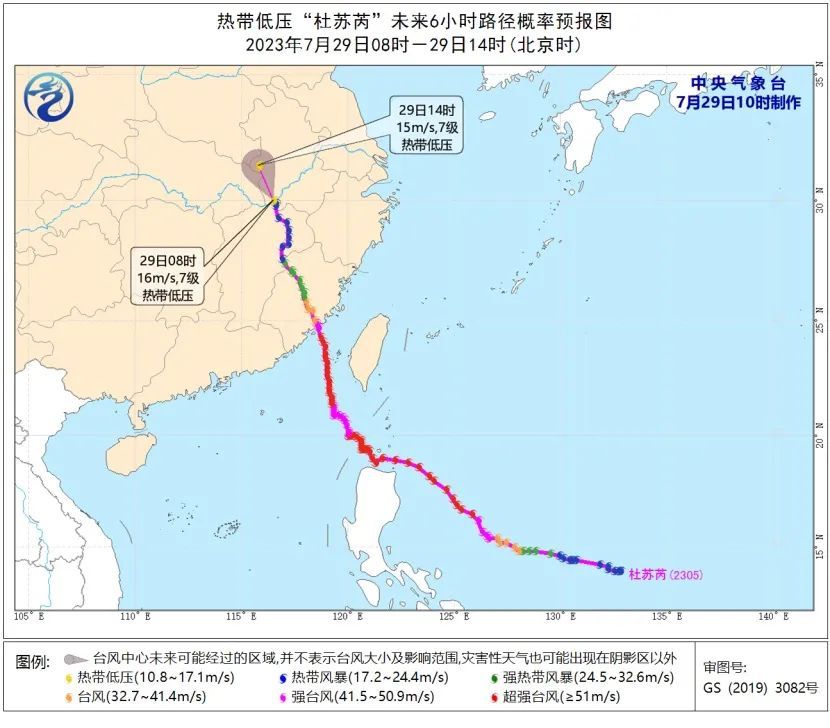 预计,热带低压“杜苏芮”将以每小时25-30公里的速度向北偏西方向移动,强度将进一步减弱。为此,中央气象台7月29日10时解除台风蓝色预警。但是,受热带低压“杜苏芮”及减弱后的残余环流影响,29日14时到30日14时,渤海南部、黄海西部、东海西北部、长江口及杭州湾附近海域仍将有6-7级、阵风8级的偏南风;安徽北部和西南部、江苏西北部、山东中西部、河南中北部、河北、北京、天津、山西东部等地部分地区有大到暴雨,其中,河北中南部、北京南部、河南北部等地部分地区有大暴雨,河北中部沿山一带等地局地特大暴雨(250~300毫米),江西东北部、福建西北部和东南部沿海、广东中部、广西东部等地部分地区有大雨或暴雨。
