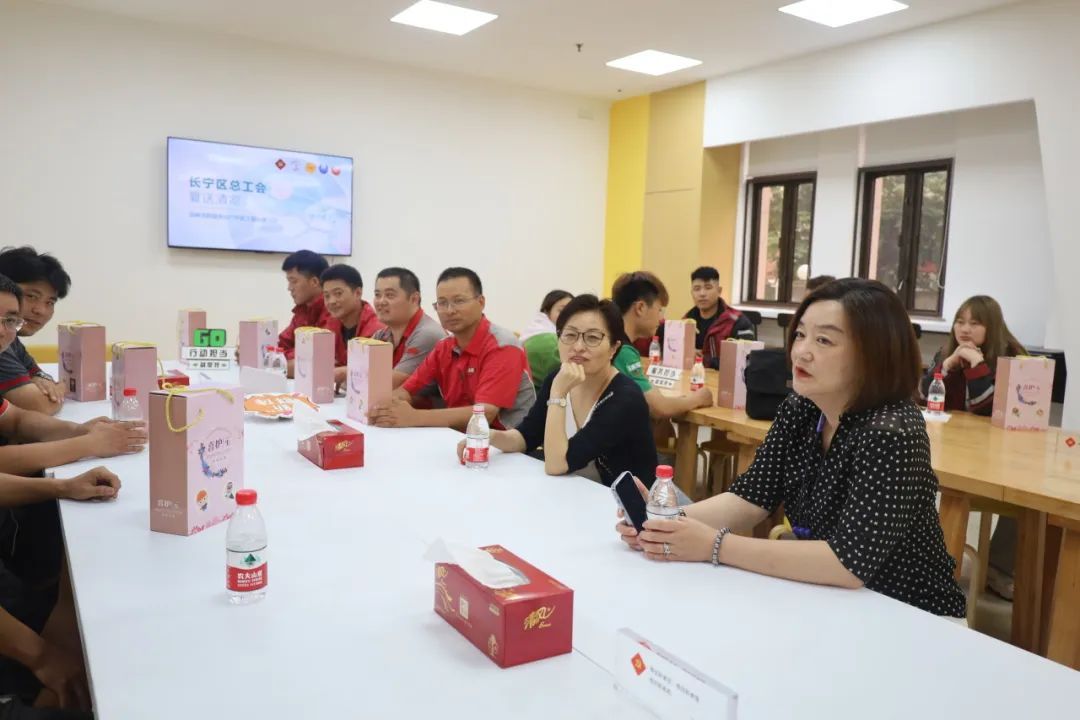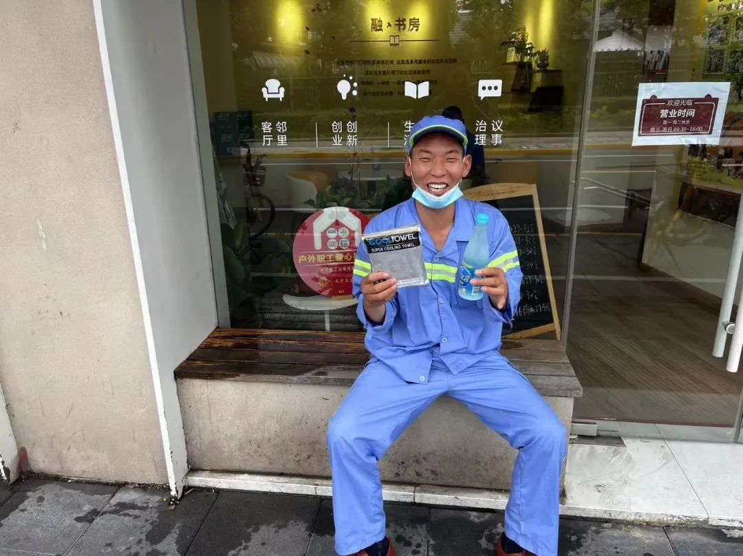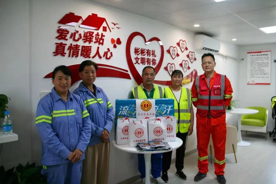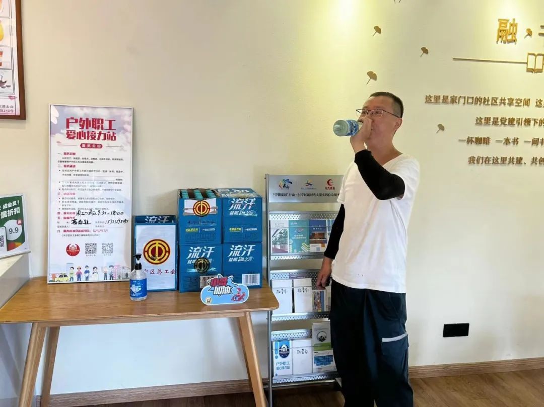 不止是一个站点,区总工会开展的“拭汗水、送清凉”关爱行动来到了长宁区各家户外职工爱心接力站。