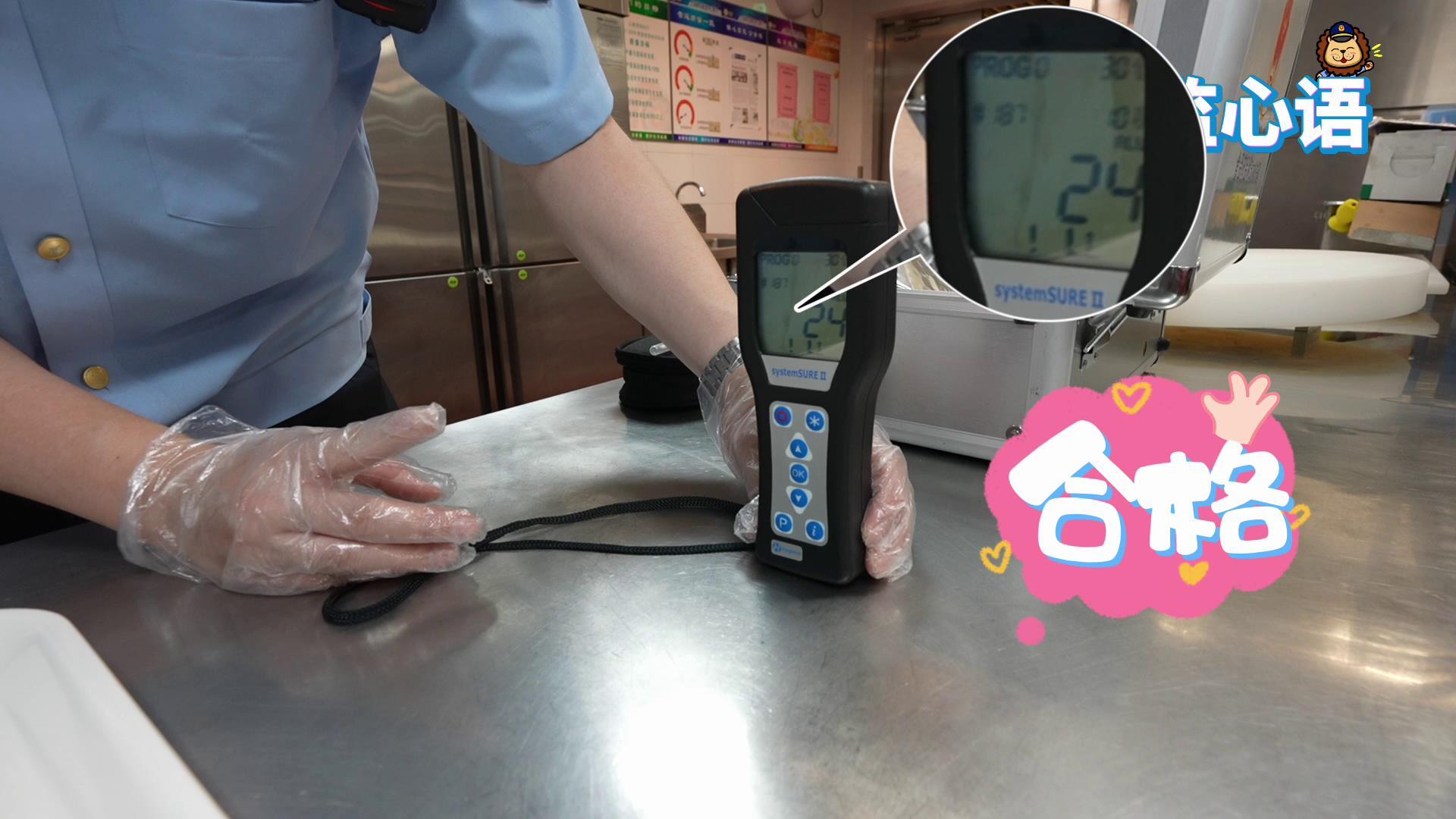 监管干部在现场进行了食品快检,这是对餐具或者从业人员手部洁净程度的一个快速检测,又称为ATP快检。一般检测出来,数值小于100就是达标的。