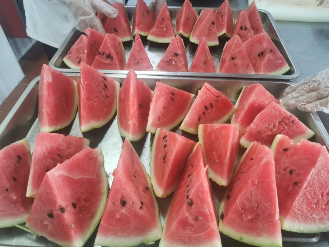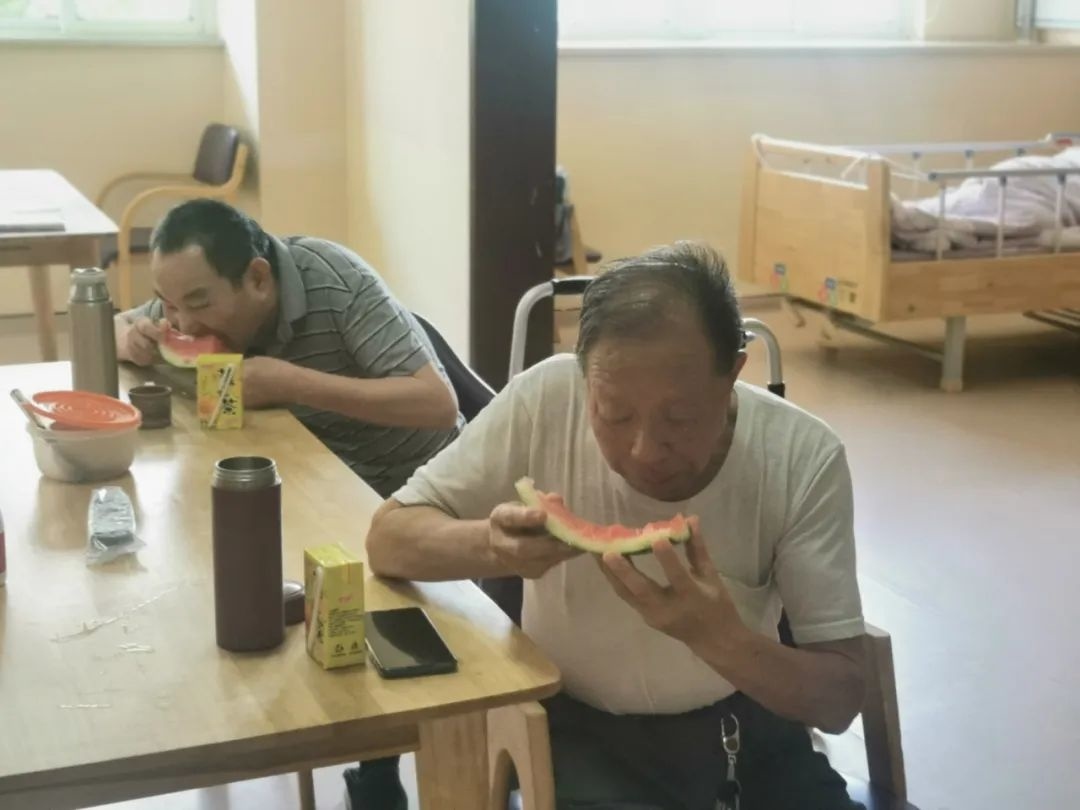 下午,区社会福利院的工作人员将西瓜切片和菊花茶等解暑饮品分发给院内的住养老人,老人们津津有味地吃着清凉多汁的西瓜。伴随着室内的空调吹送出阵阵凉风,老人们十分惬意地享受午后时光。