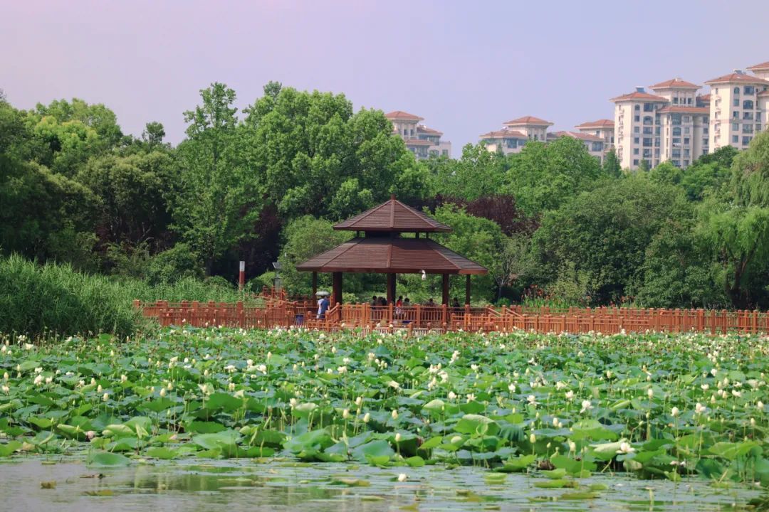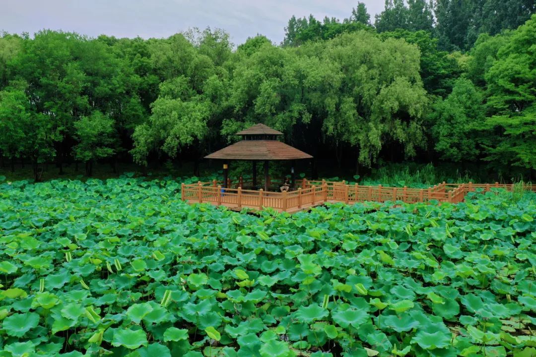 望月亭曲径通幽,是一个很静谧的景点,坐在望月亭放眼望去,湖面上翠绿的荷叶连成一片,朵朵粉色的荷花点缀其间,犹如来到世外桃源。