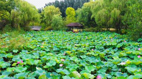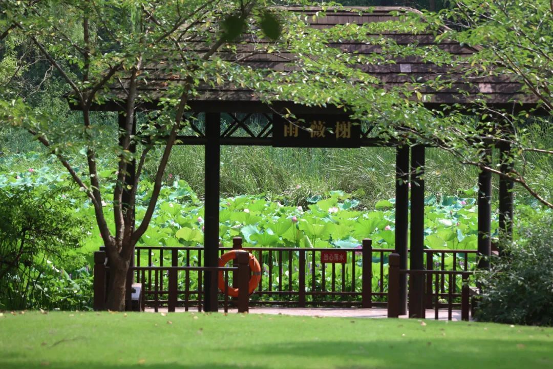 严家港桥南侧的雨薇榭与北侧的望月亭相得益彰,是赏荷的另一绝佳景点,雨薇榭安静古朴,被绿树环抱,在此赏荷有“水光潋艳晴方好,山色空蒙雨亦奇”之感。