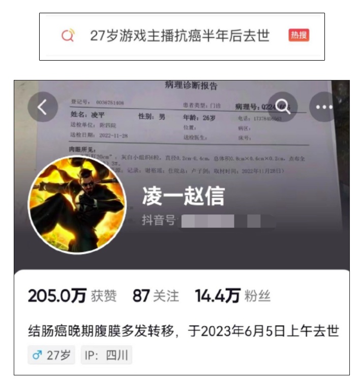 无独有偶,今年6月5日,拥有13万粉丝的游戏博主“凌一赵信”(本名:凌平)确诊结肠癌仅半年,不幸去世,年仅27岁。