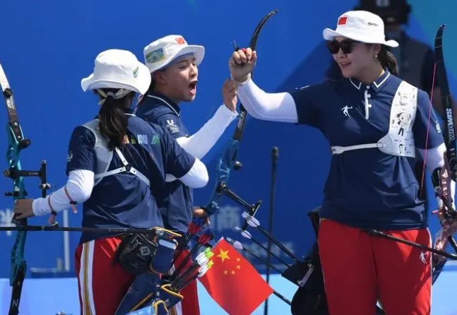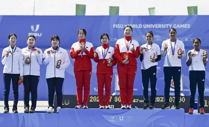 捷报 7月30日,在成都举行的第31届世界大学生夏季运动会女子反曲弓团体金牌赛中,中国女子反曲弓队在附加局5比4战胜韩国队,以1环优势争得团体赛冠军,为中国射箭队再添一枚金牌。其中,奉贤区体育训练中心输送运动员周丹琰发挥出色,帮助中国队夺冠! 7月30日,中国队选手周丹琰、王黎敏、李新鑫(从左至右)在颁奖仪式上庆祝。 7月30日,冠军中国队(中)运动员周丹琰、王黎敏、李新鑫(从左至右)在颁奖仪式上。 7月30日,女子射箭反曲弓团体金牌赛胜利喝彩。 韩国队首局第一箭出现严重失误,仅打出2环。而中国队的周丹琰和王黎敏发挥出色,连续射中10环,为中国队拿下首局奠定基础。中国队在首局获胜得两分。第二局和第三局比赛韩国队的发挥几乎没有破绽。第四局决战,韩国队率先出现失误射出7环,中国队的周丹琰发挥出色,帮助中国队将比赛拖入附加局。附加局中,中国队队员王黎敏打出10环,周丹琰打出8环,李新鑫打出8环。 最终,中国队以28∶27的1环优势赢得胜利。这是中国体育代表团在成都大运会获得的第10枚金牌。