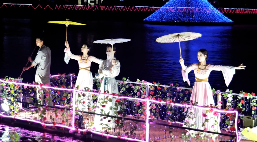 除了奇妙的灯光场景,现场还设有合唱、乐器体验等互动项目,并安排有花船演绎、水雾溪纱等精彩的歌舞表演。