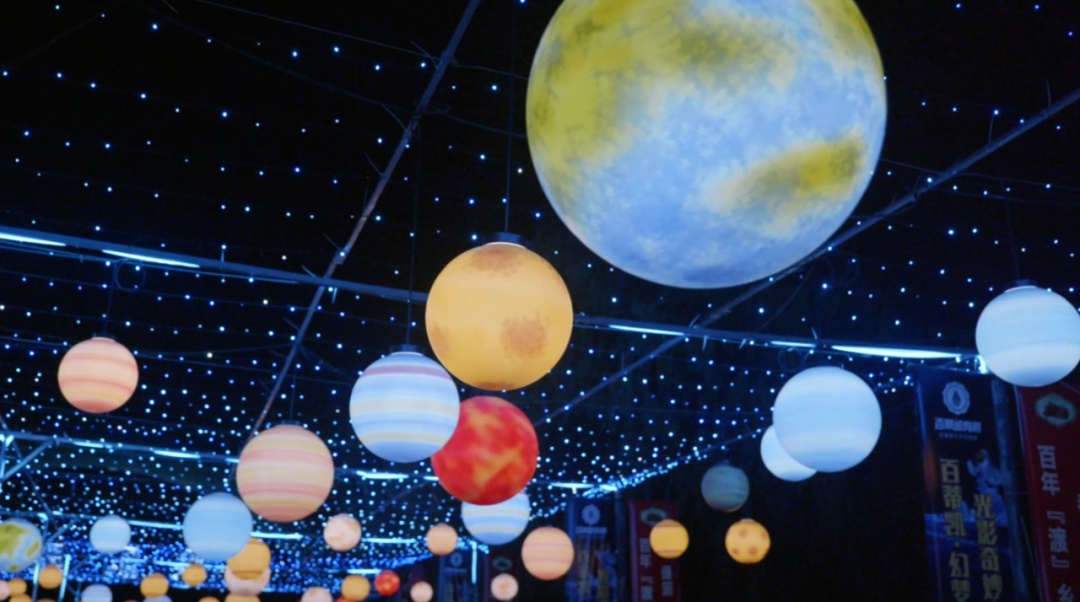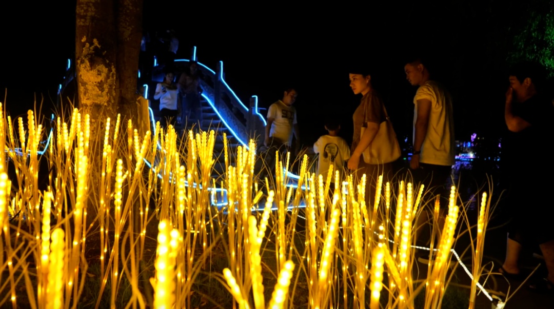 在景点“田园麦穗”里,金黄灿烂的小麦漫山遍野。“这些麦穗的灯光,像是真的麦子,小朋友感觉很新奇。”市民黄女士的孩子为眼前的场景吸引,弯下腰端详起一串串麦穗状的小灯。