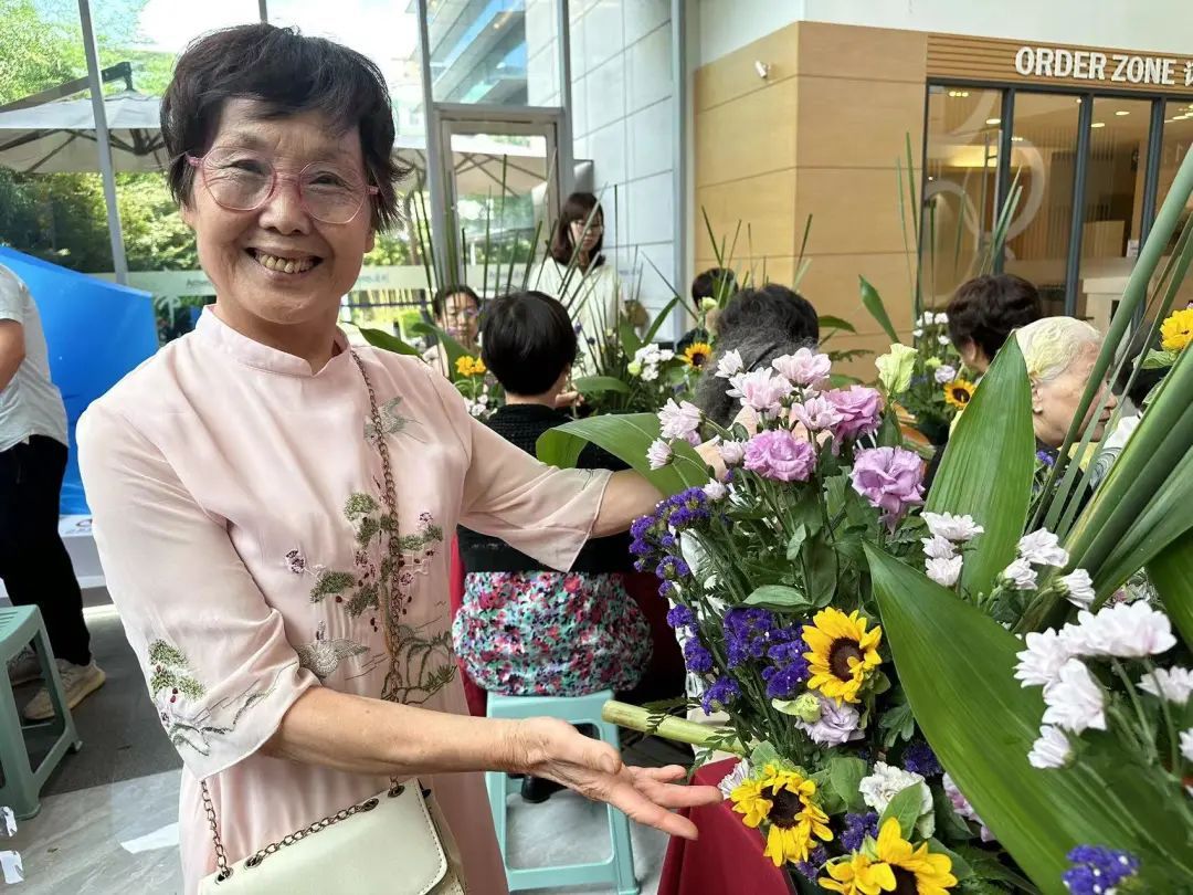 “先搭框架,再找焦点,再填充。”参加比赛的蓝阿婆说:“今年已经84岁了,平时就喜欢在家种种花花草草,家里的阳台都种满了,今天听到社区有插花,也是第一次参加这样的活动,感觉开心、不烦恼,心态也年轻了。”现场的指导老师告诉记者,“插花艺术是对美好生活的向往的一种展现,是自然美、线条美、意境美的表现,是一门技术,更是一门艺术,当插出属于自己的最独特、最美花束时,就会感觉非常地美好。”
