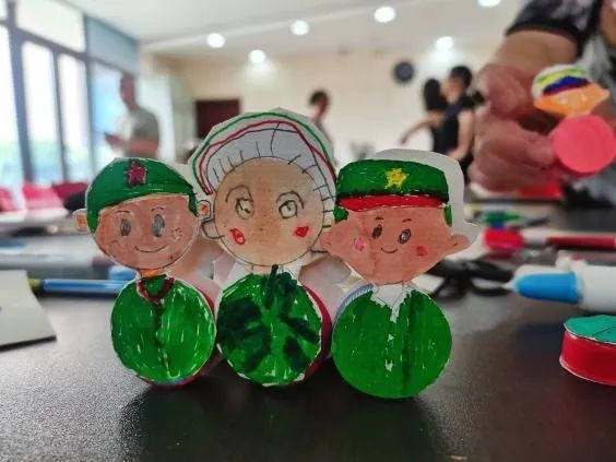 “小小兵不倒翁”手作环节,孩子们都跃跃欲试。在社工的引导下,大家画出心中的军人形象,绿色军帽,绿色军服,英姿飒爽。配合不倒翁制作原理,孩子们设计的每一张小画都神奇地变成了不倒翁。
