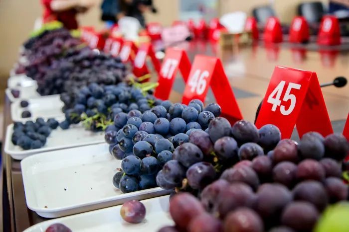 在葡萄品鉴区,61个葡萄样品一字排开。除了巨峰、夏黑、醉金香、阳光玫瑰等老面孔外,还有妮娜皇后、浪漫红颜、申华、巨盛等新面孔。