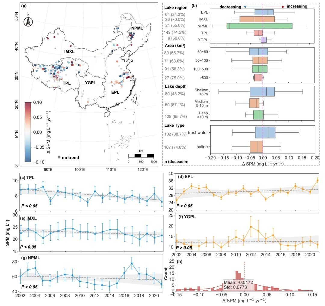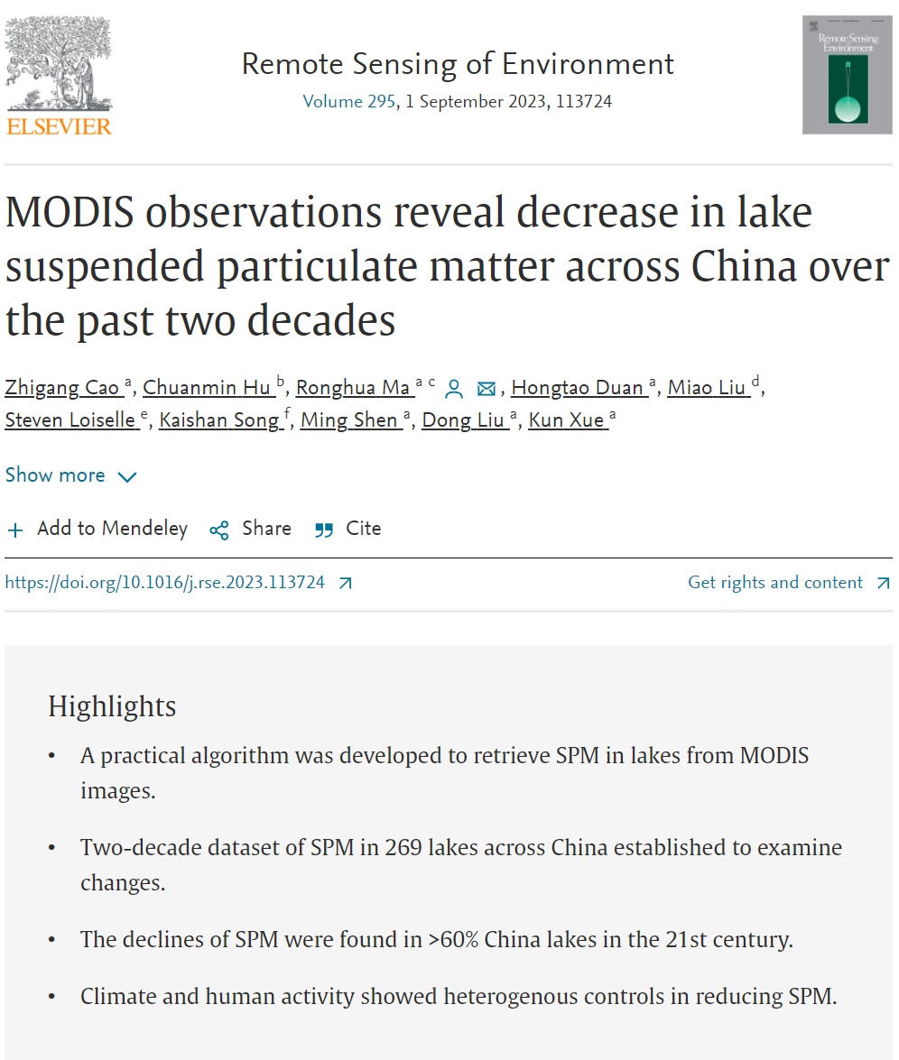 交汇点讯 近日,中国科学院南京地理与湖泊研究所马荣华研究员课题组成员曹志刚博士联合南佛罗里达大学、锡耶纳大学、中国科学院东北地理与农业生态研究所等科研人员,基于长期以来的实测调查数据,发展了基于MODIS卫星数据的中国湖泊悬浮物反演算法,揭示了2002年以来中国30k㎡以上中大型湖泊的悬浮物时空变化和影响因素。研究成果以“MODIS observations reveal decrease in lake suspended particulate matter across China over the past two decades”为题,近期发表在遥感顶级期刊《Remote Sensing of Environment》上。