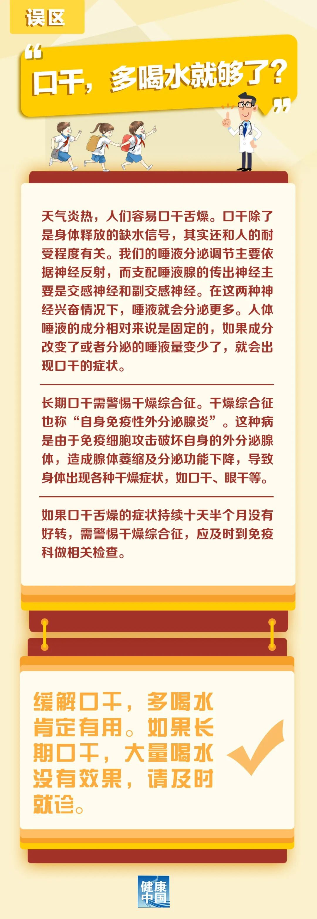 最近,天气炎热,很多人都有口干舌燥的感觉。那么,感觉口干,是否多喝水就够了?需要警惕其他疾病吗?