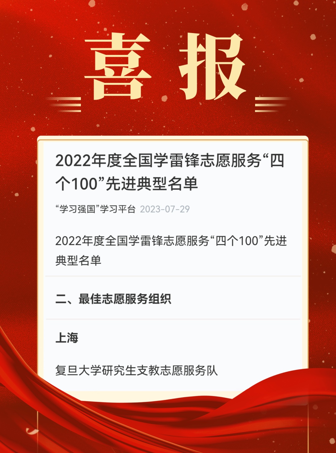 近日,2022年度全国学雷锋志愿服务“四个100”先进典型名单公布!复旦大学研究生支教志愿服务队获评“最佳志愿服务组织”。