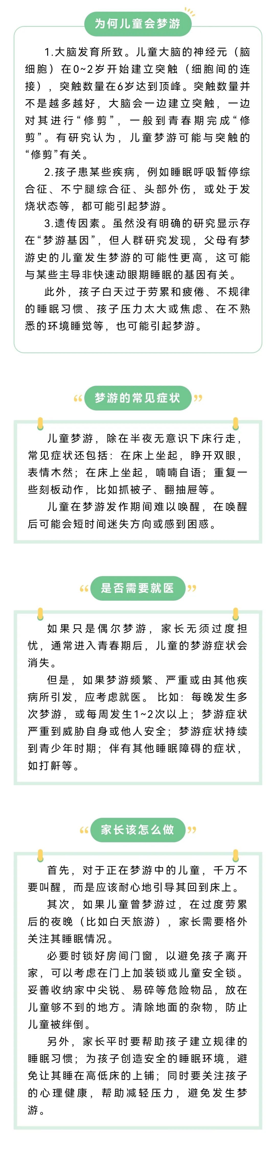 梦游,指夜间人在半睡半醒的状态下从床上坐起,或四处走动或进行其他活动,是一种睡眠障碍。梦游在儿童群体中比成人更常见。在此,上海市疾病预防控制中心专家为大家带来关于儿童梦游的健康科普~