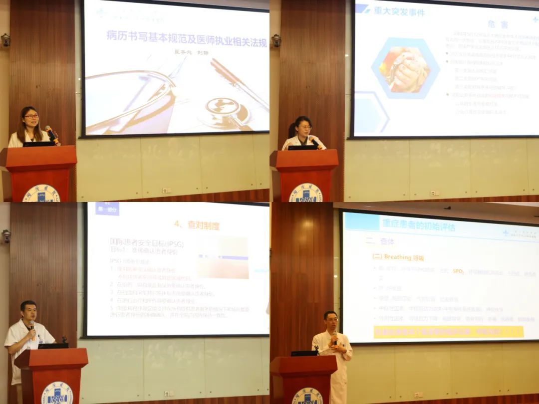 接下来几天,老师们从住培政策与管理制度、临床基本实践规范与流程、医学人文素养、专业理论知识、基本技能操作、综合能力提升等六大方面对新学员们进行入院培训。医务处处长吴慧民就医疗质量安全核心制度落实与风险规范进行讲解,深刻提高了新学员的法律意识、全员意识、量化意识等,十八项核心制度将贯穿于新学员的整个医疗过程。党委办公室副主任车娜介绍了重大突发事件下的医师职业素质,医生肩负着护卫人民健康的重任,职业赋予的使命感激励医务人员不断精进能力,救死扶伤,当人民需要时勇于担当、责无旁贷。外科专业基地指导医师黄晓松对新学员介绍了过程管理与学习考核要求,对新学员对迎接即将来临的各项考试,如何进行自我规划和管理提供了极大的帮助。规培办老师胡予对住院医师日常管理与保障进行了说明,新学员对培养基轮转要求、考试考核制度及评优评先等有了更清晰的认识,对未来规培生涯有了更符合实际的规划。