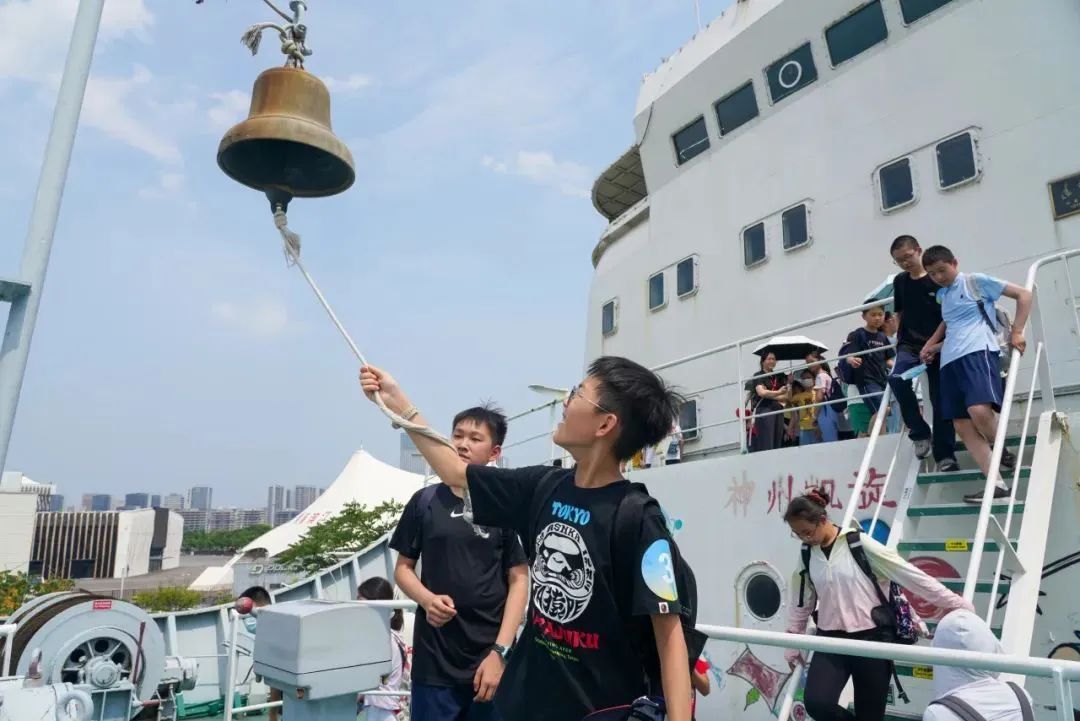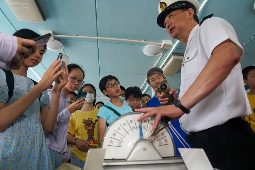 在我国第一艘远洋测量船“远望1号”上,学生们参观游览了整艘船舶,从仪器繁多的驾驶舱到视野开阔的船艏甲板,再到排列着一间间船员休息室的船舱,实地了解了上世纪70年代我国远洋船舶的生活条件与国防科技发展状况。