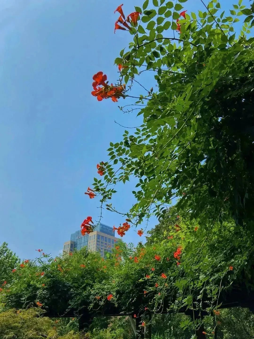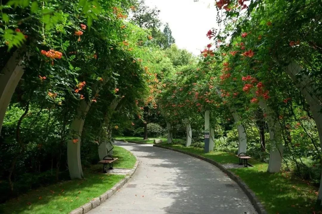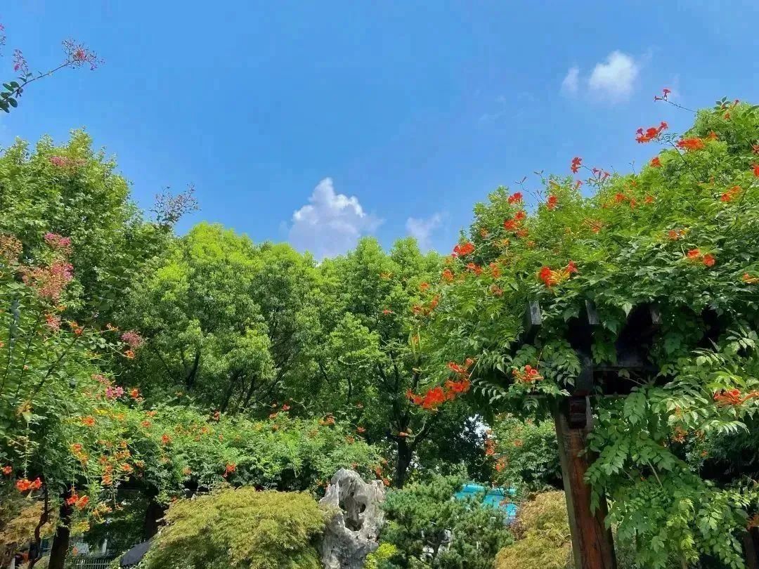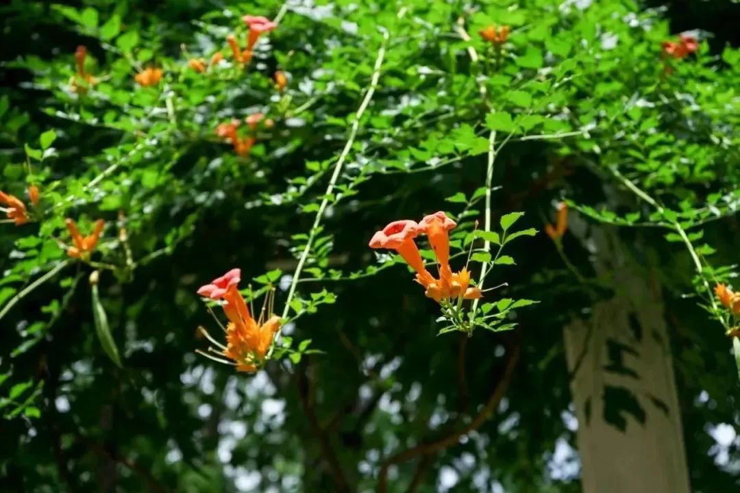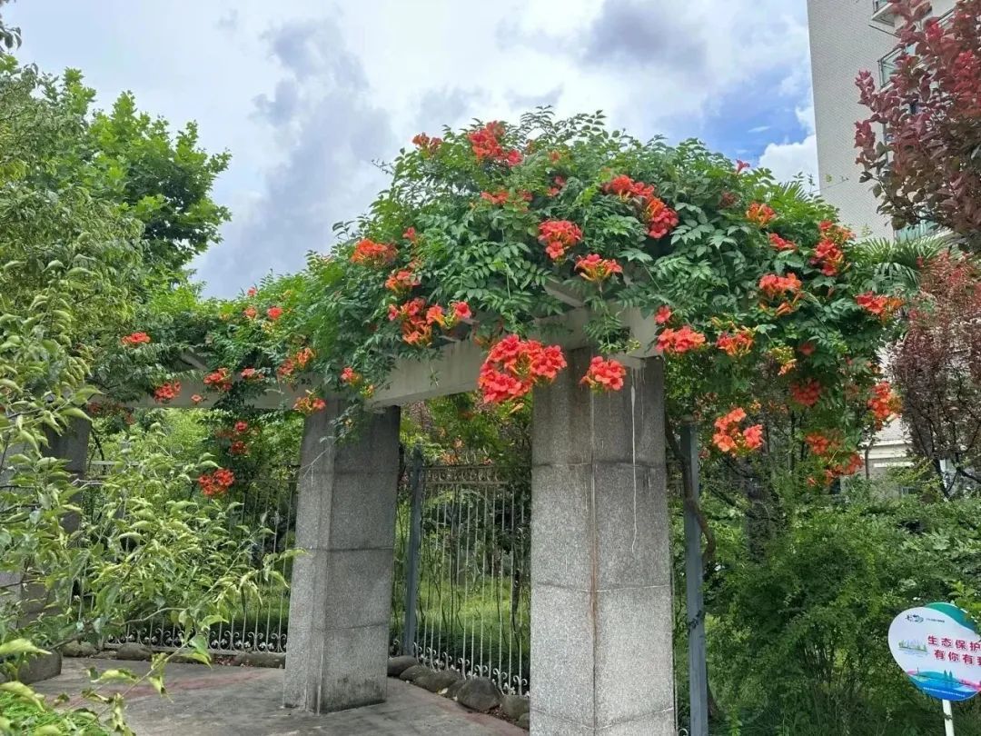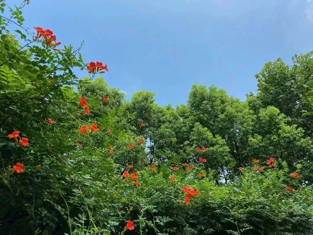 盛夏,漫步在清涧公园的凌霄花道处,浓密的绿叶中,正燃起一片火红,全长52米,由15组藤蔓造型构成的钢架,满种着凌霄,在烈日炙烤下,一簇簇“喇叭”热情似火,向阳而立、溢翠飞红、艳若云霞。