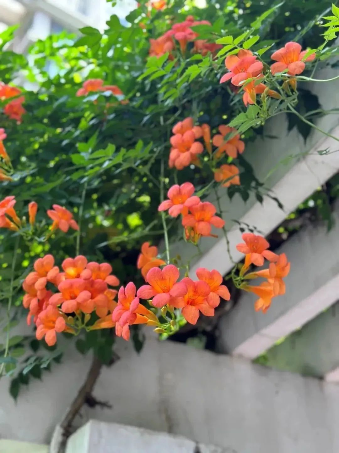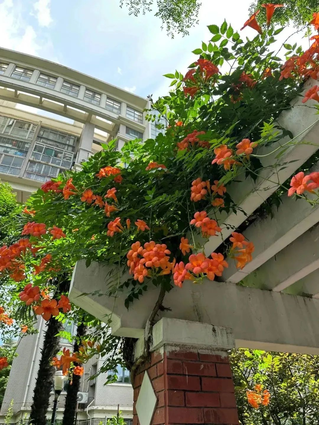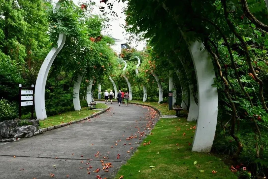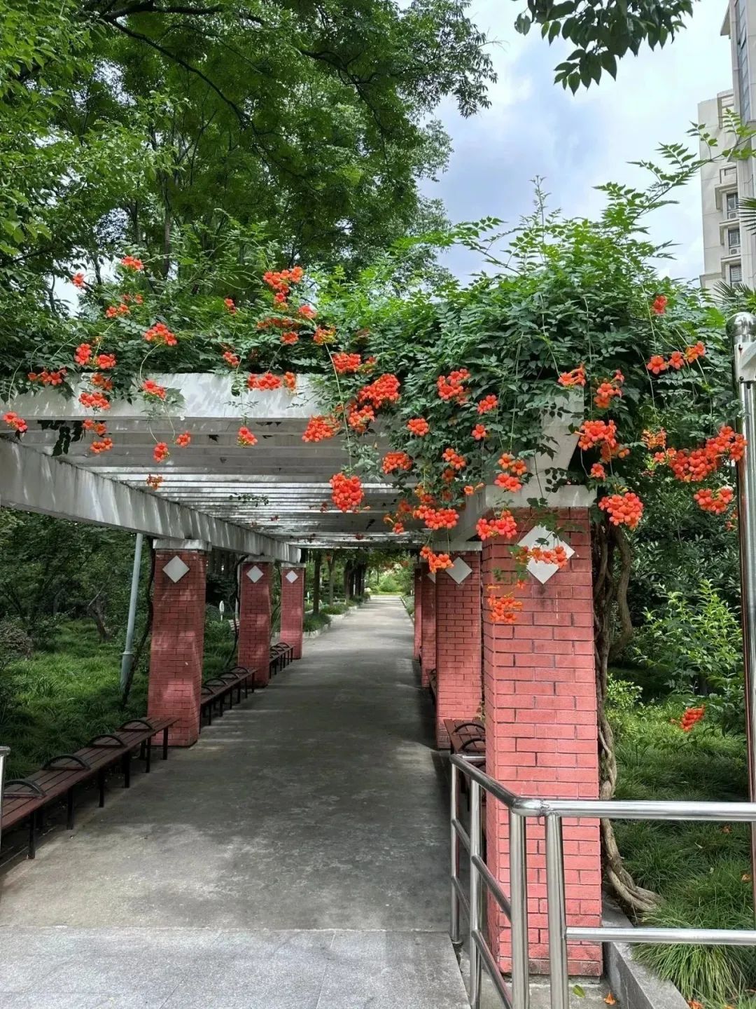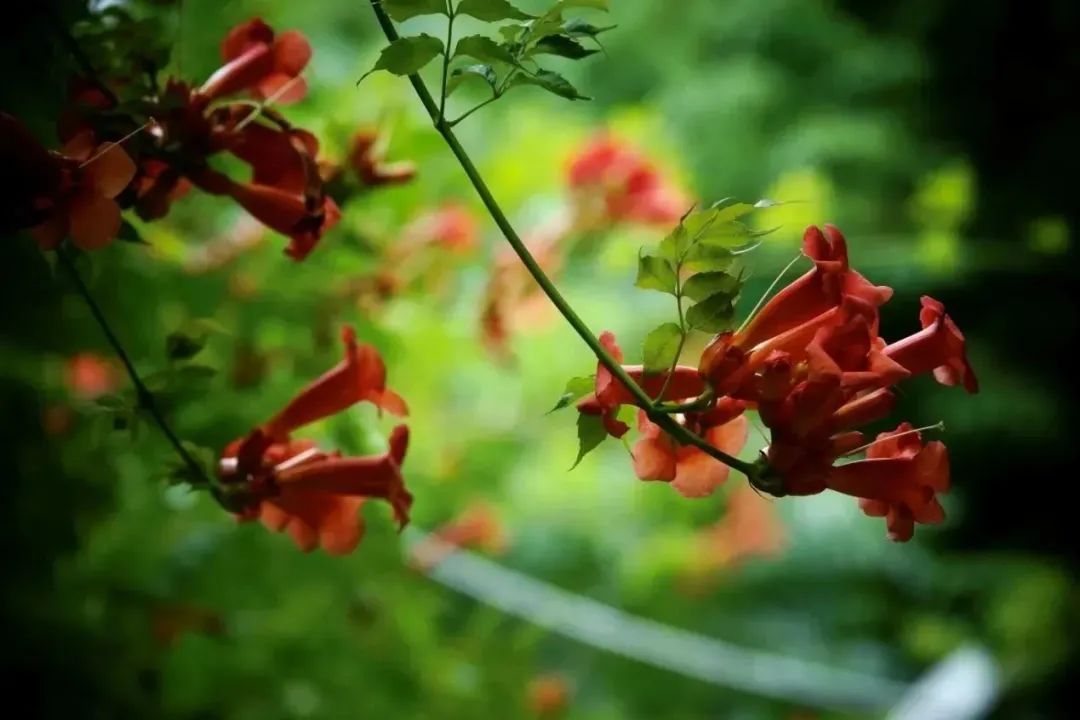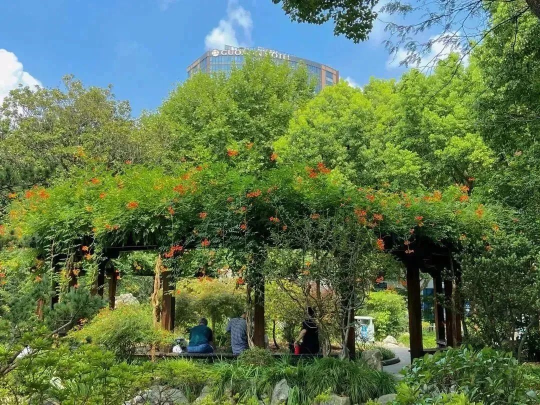 盛夏,漫步在清涧公园的凌霄花道处,浓密的绿叶中,正燃起一片火红,全长52米,由15组藤蔓造型构成的钢架,满种着凌霄,在烈日炙烤下,一簇簇“喇叭”热情似火,向阳而立、溢翠飞红、艳若云霞。