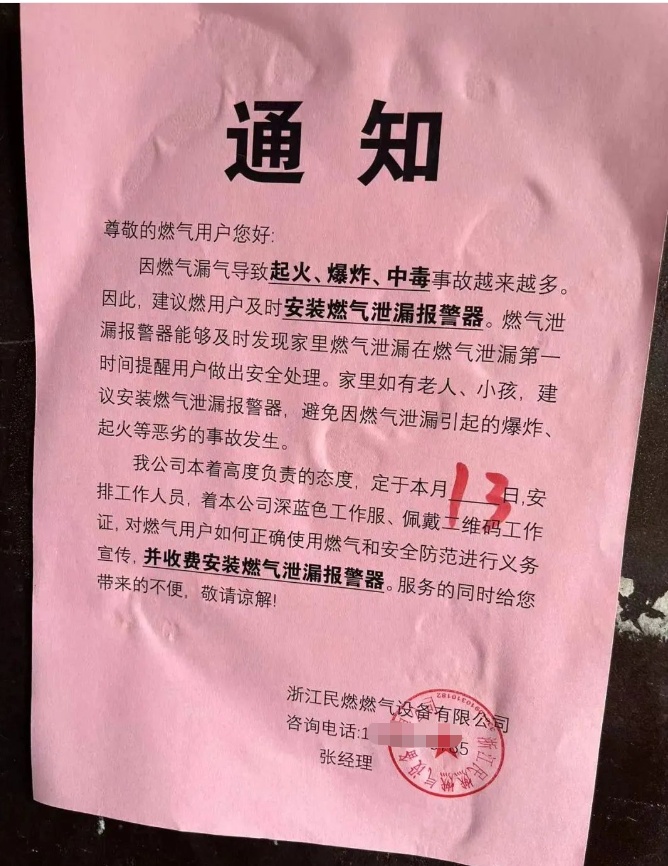 近日,浙江绍兴诸暨市天然气有限公司接到暨阳街道蠡湖新村吴阿姨来电,反映有人以燃气公司排查安全隐患为由,要求用户安装燃气泄漏报警器,并现场收取高额费用。