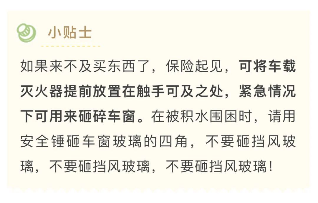 暴雨行车多危险,不妨在车内准备一些应急物品。安全锤、手电、线锯、车载手机充电器、具有一定浮力作用的抱枕,必不可少。