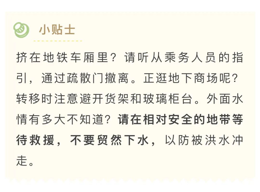 城市里的人,请尽快撤离洪水涌来的地方,不要企图穿越被洪水淹没的马路。如发现附近有漩涡,别好奇了,立马绕行。远离导电体,如落入水中的电线、高大的树木、高压电塔等。多人转移时,可以相互用绳子牵着走。