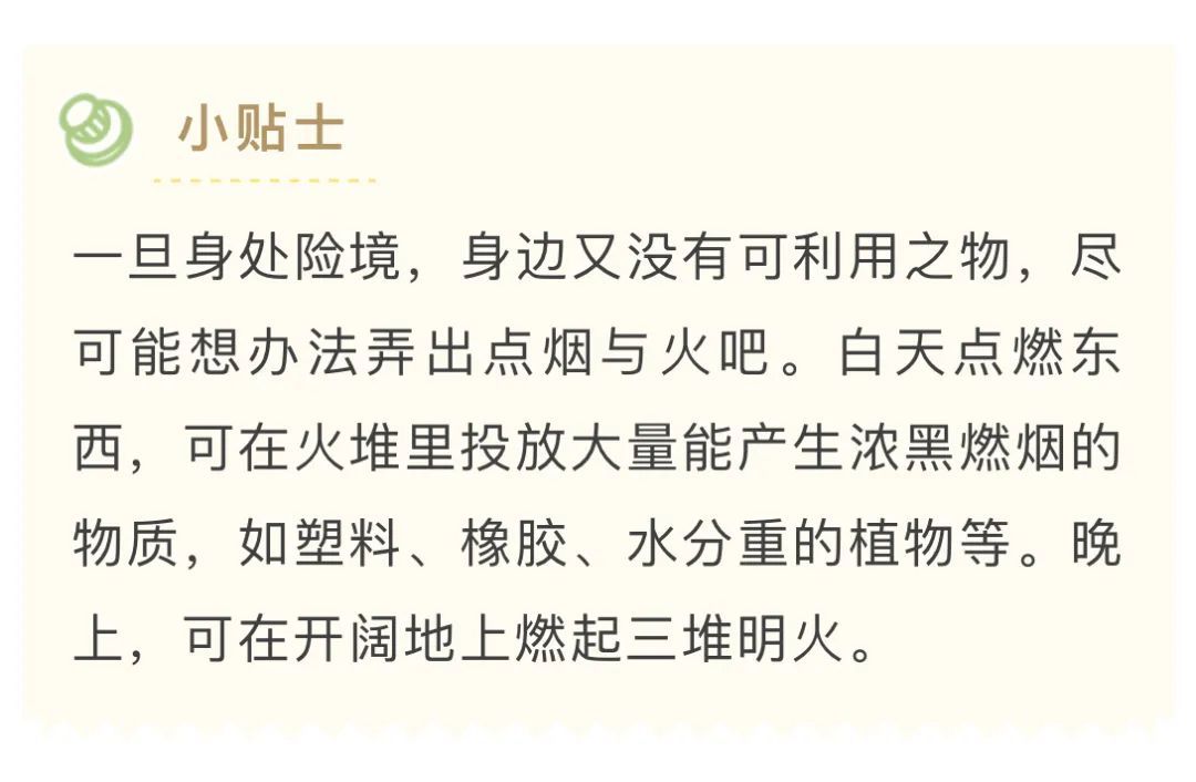 求救方式三,光信号。如果电话掉了,嗓子也哑了,怎么找存在感呢?这时电影里的桥段可能会给你灵感:白天用镜子借助阳光,向过往的人或车辆、空中的救援飞机等反射光信号。夜晚用手电筒,一闪一闪的。三长三短,不断循环。